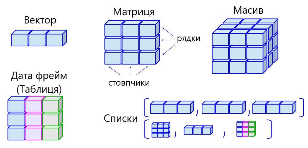 Дата фрейми (data frames): різні стовпчики можуть містити різний тип даних (але їх довжина має бути однаковою). Для створення дата фрейму використовується функція data.frame().