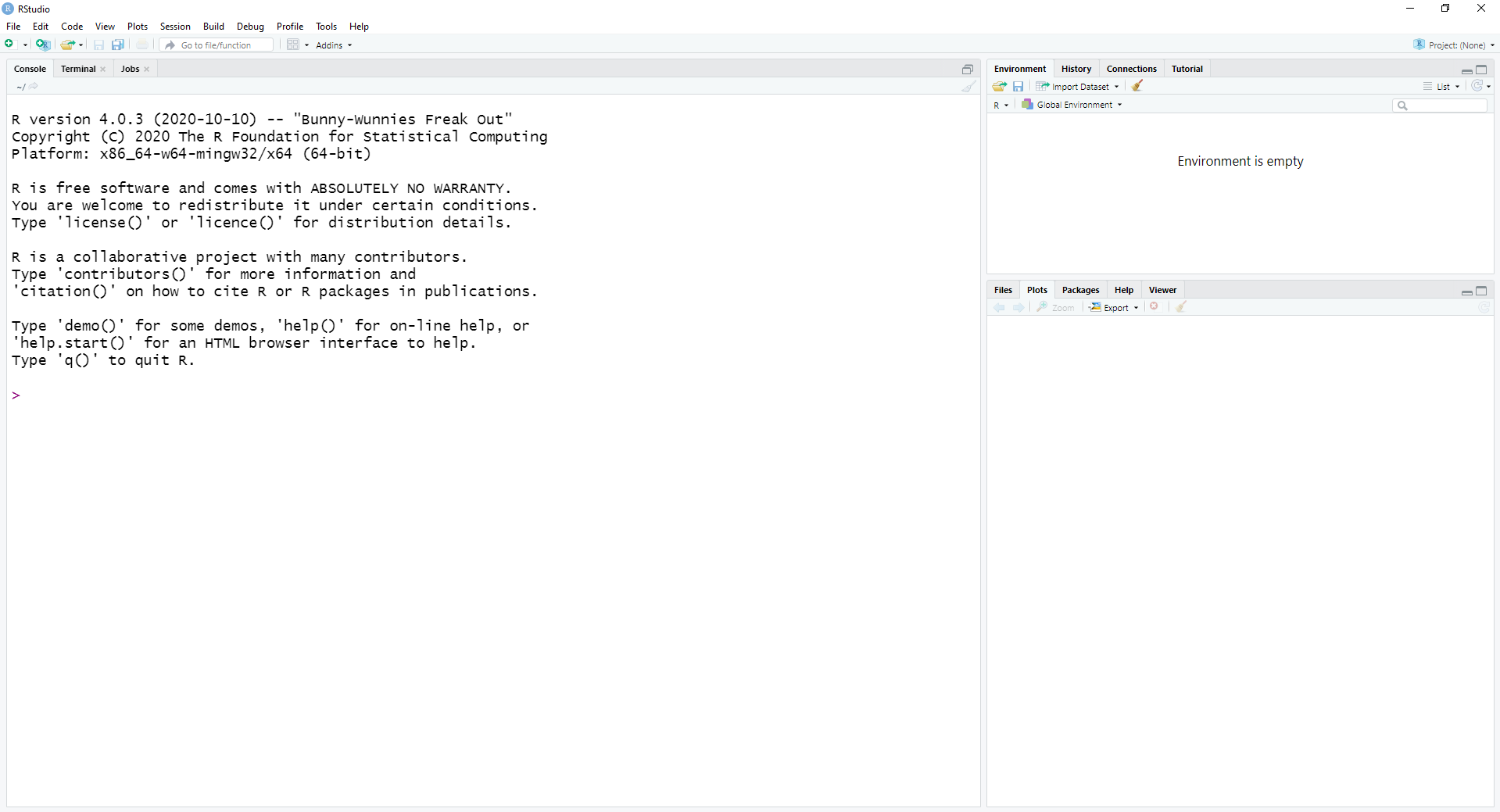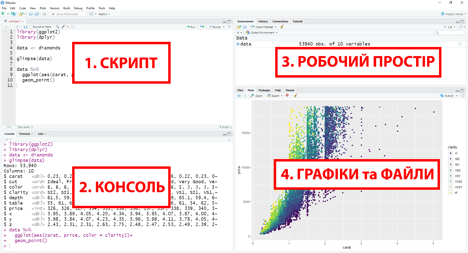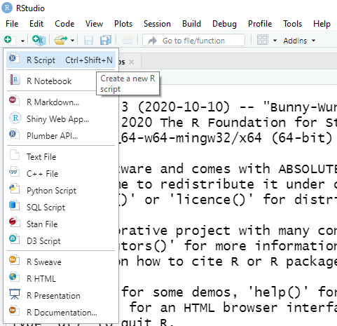 Як правило код пишуть у скрипті (такий собі аналог текстового редактора), тож для його створення необхідно натиснути зелений хрестик в лівому верхньому куті та обрати пункт R Script або натиснути комбінацію клавіш Ctrl+Shift+N: