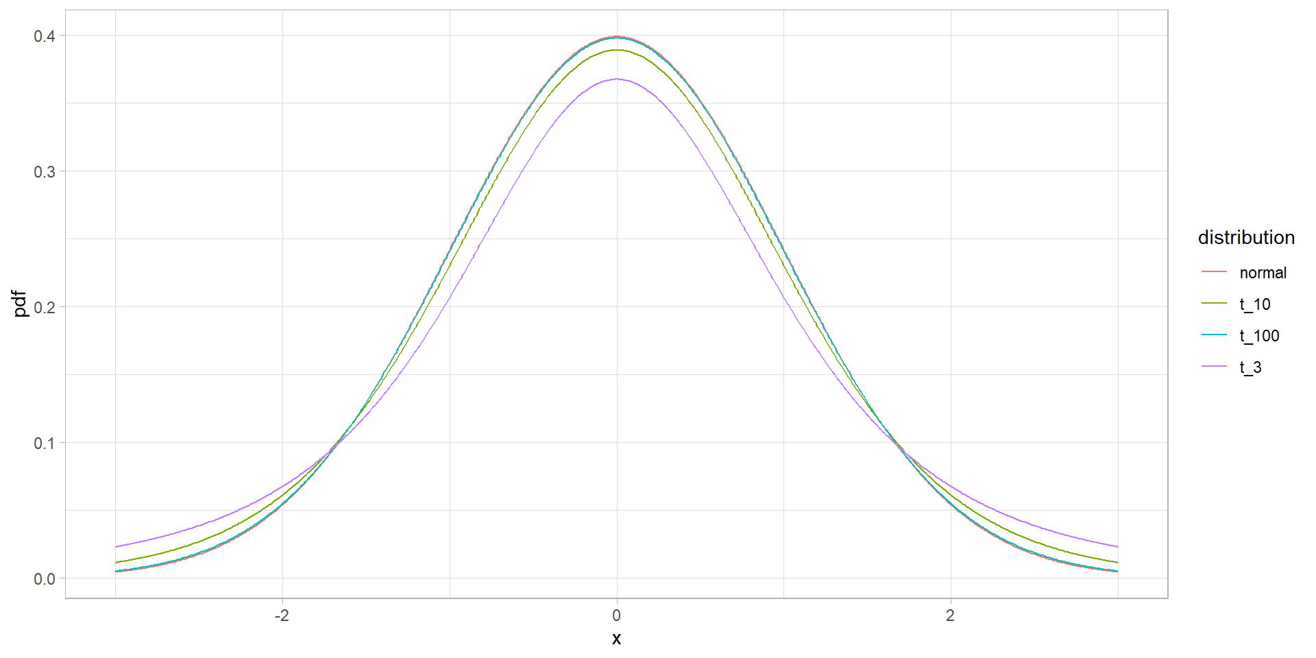 Однак, ми вже з’ясували, що насправді ми отримуємо не нормально-розподілену величину, а величину, розподілену за розподілом Стьюдента з деяким параметром ступеня свободи \(df\).