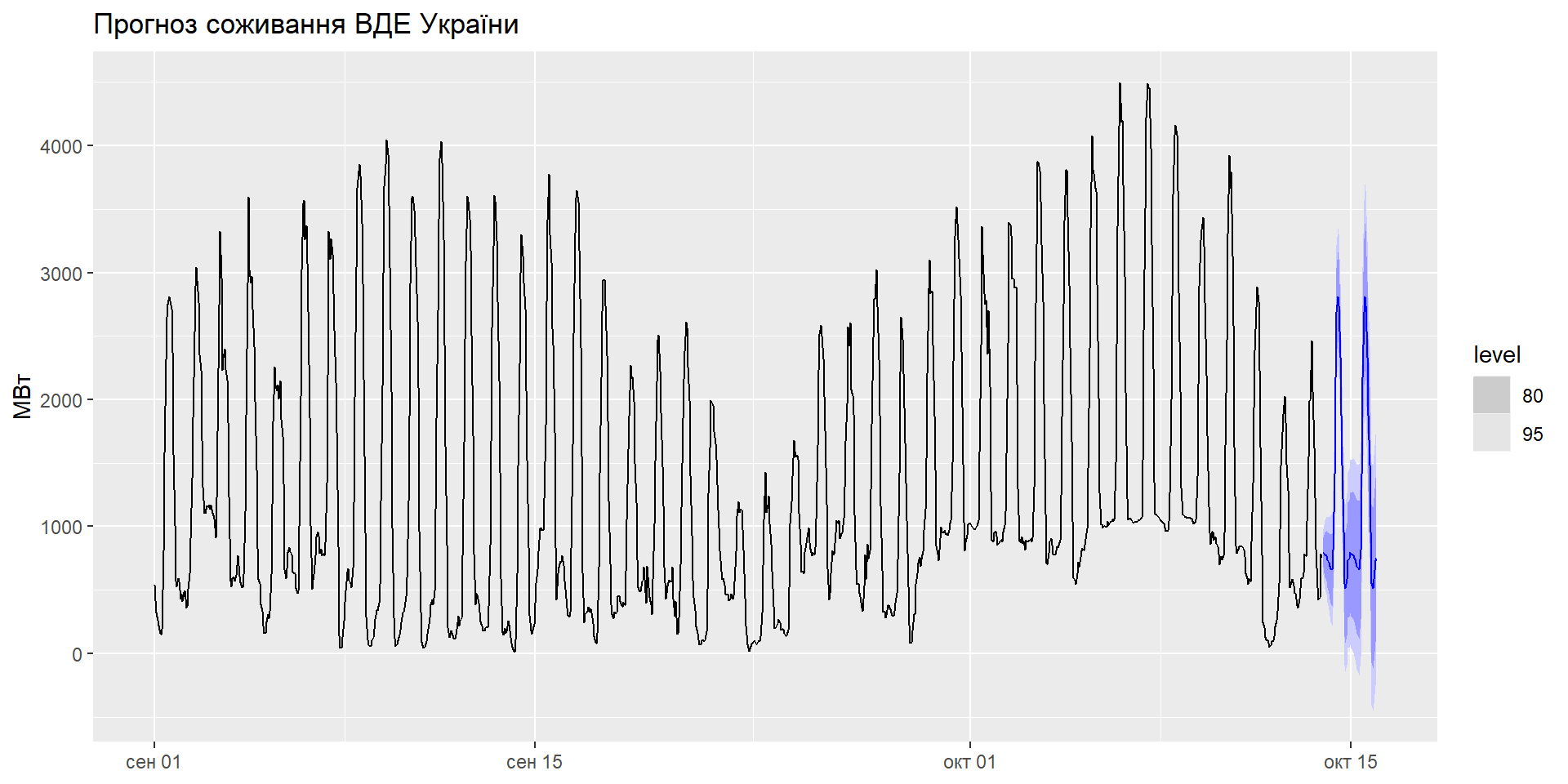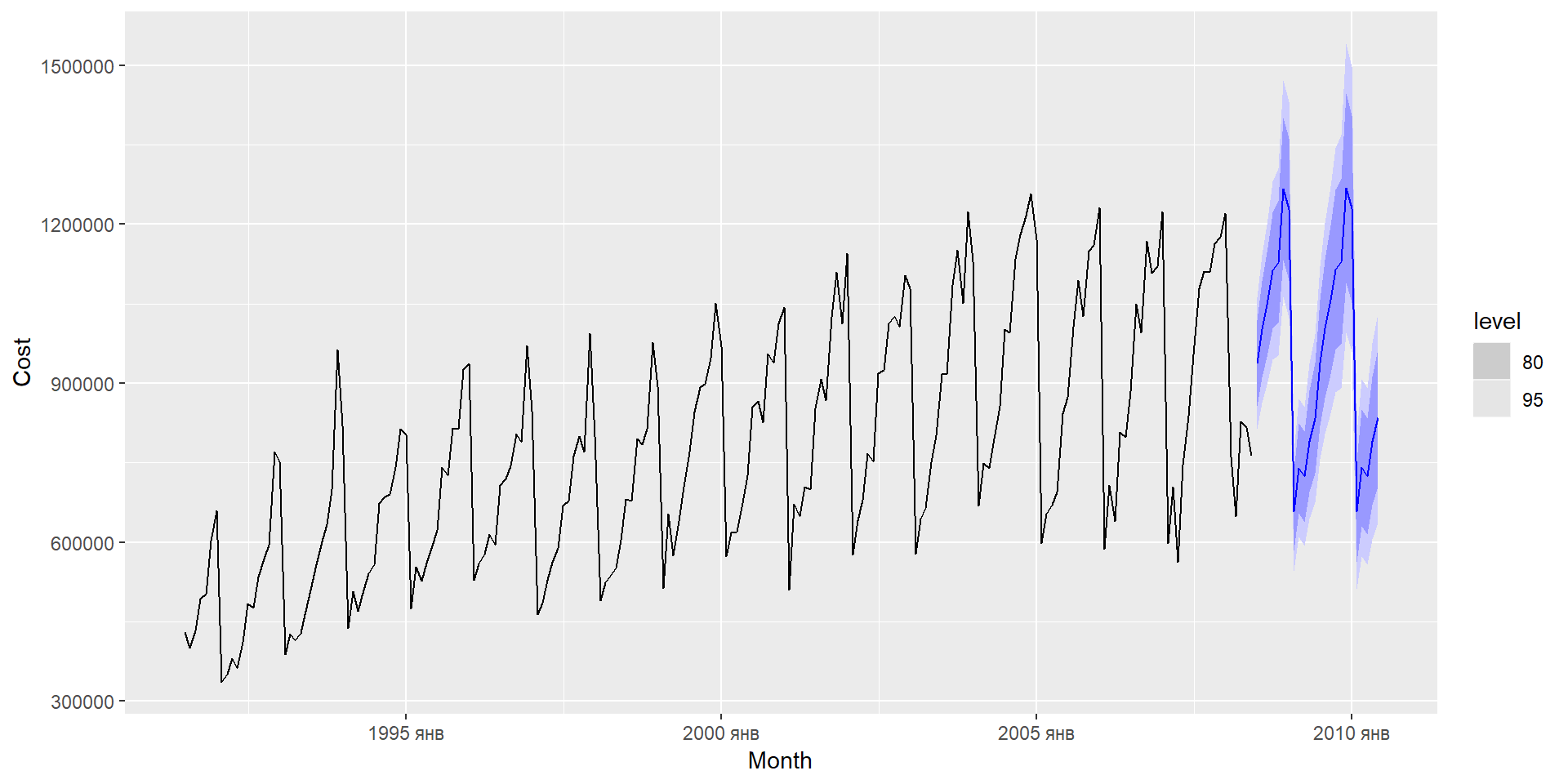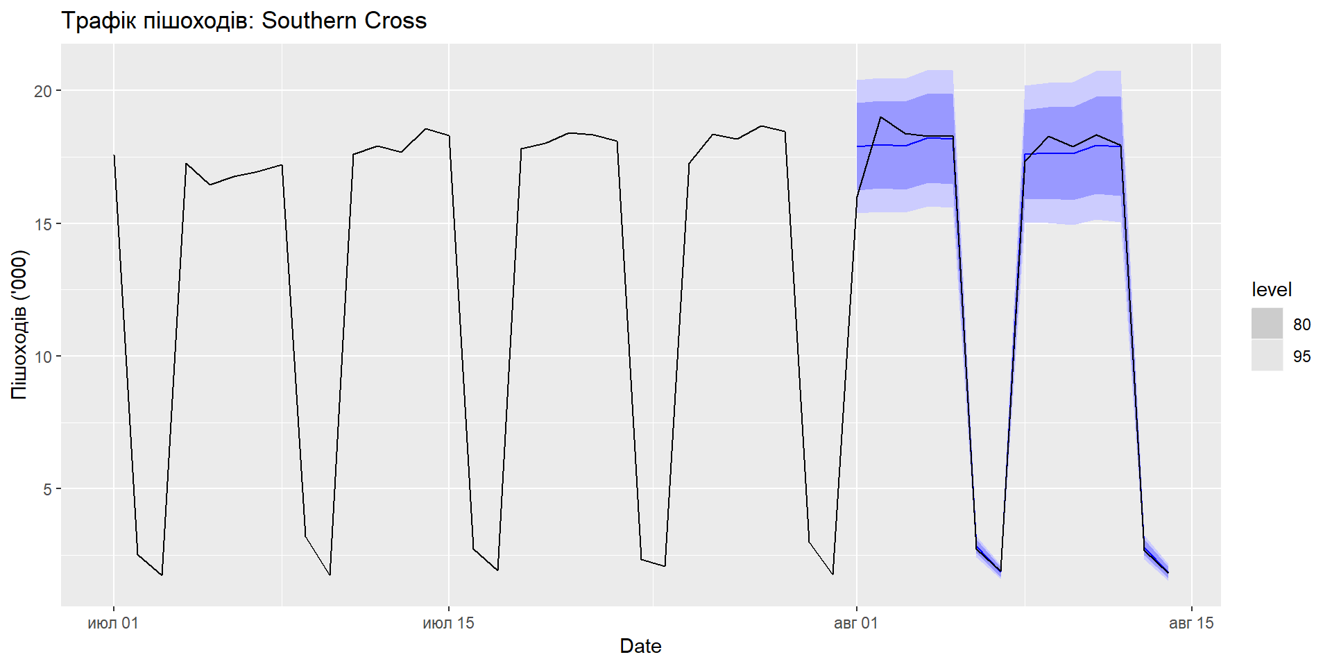 Для більшості ETS моделей ДІ: \[\hat{y}_{T+h|T} \pm c \sigma_h\] де \(c\) - показник ймовірності, а \(\sigma_h\) стандартне відхилення прогнозу