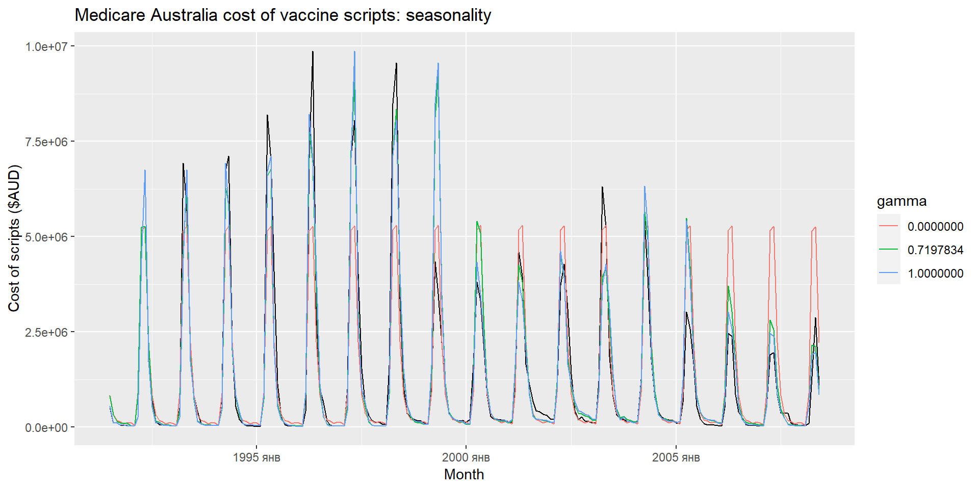 Тренд: \(\quad \quad b_{t} = \beta^*(\ell_{t} - \ell_{t-1}) + (1 -\beta^*)b_{t-1},\)