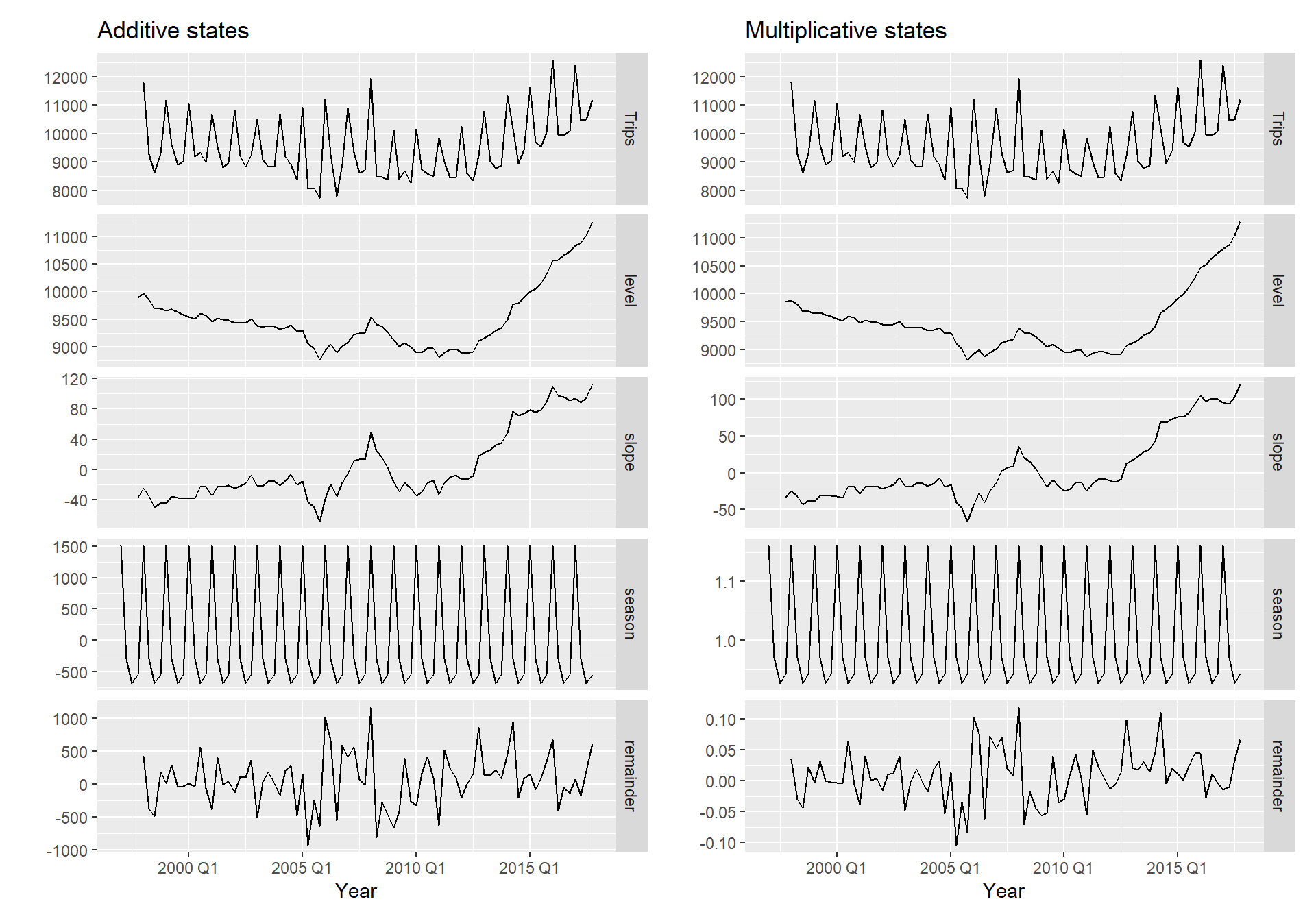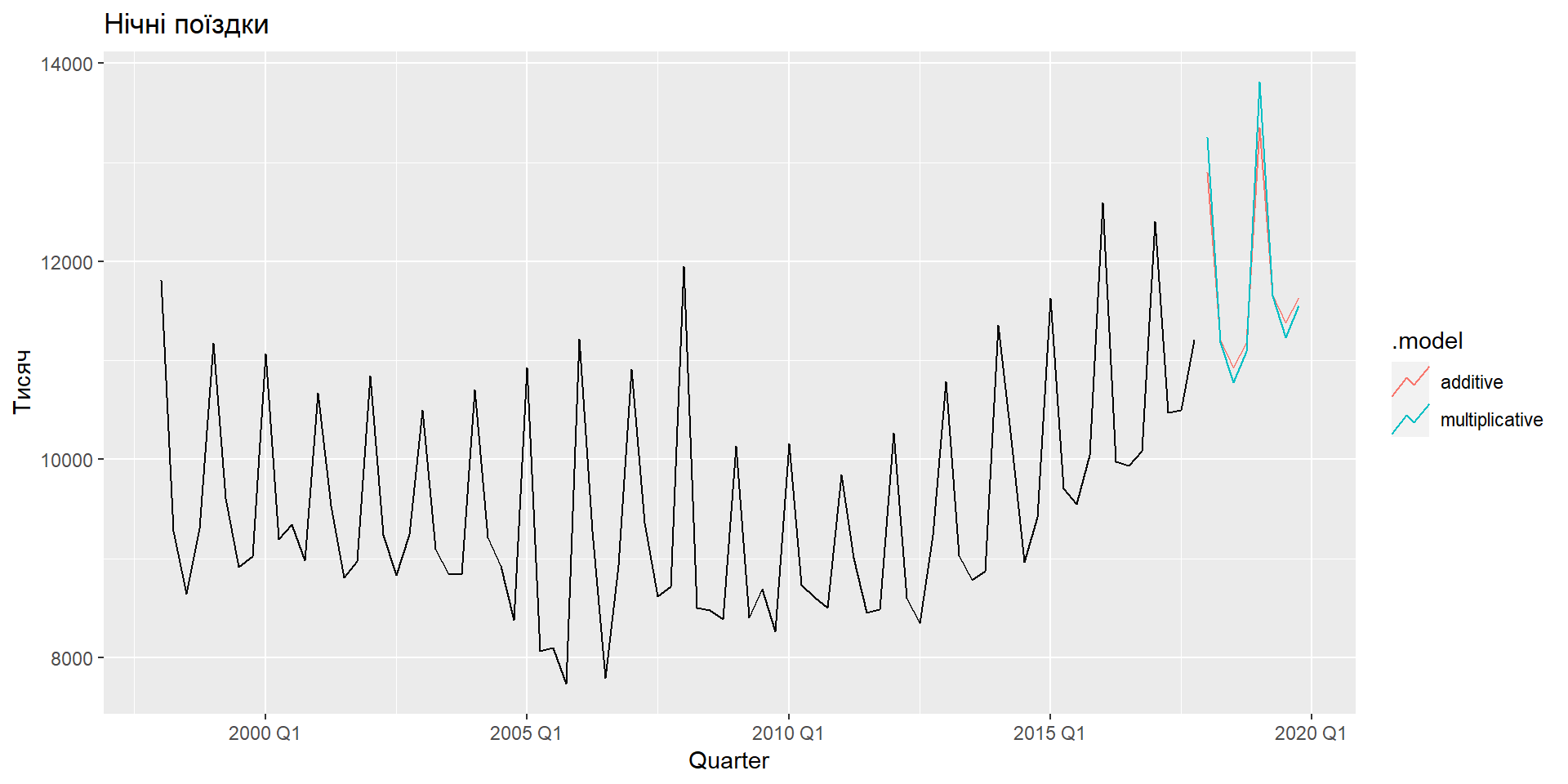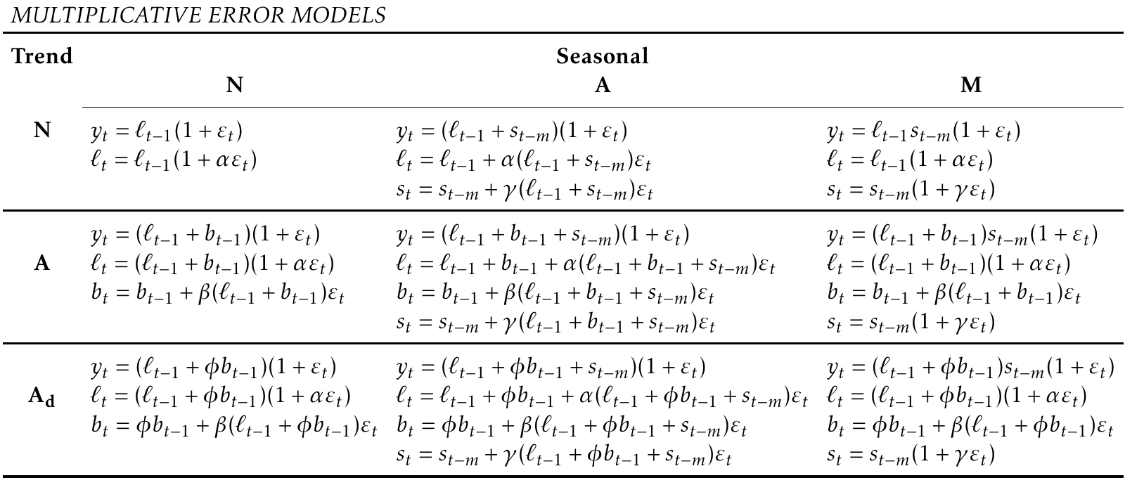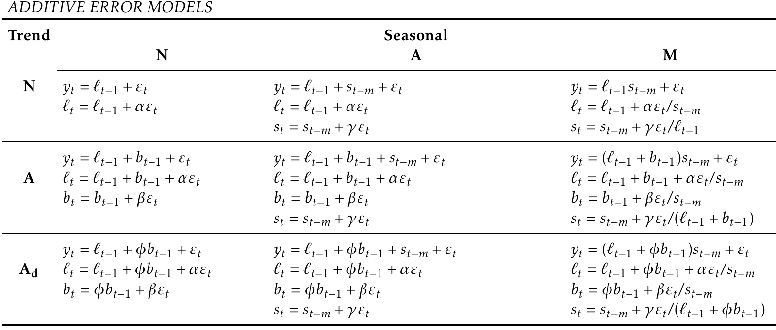 Моделі з мультиплікативними помилками корисні для позитивних даних, але є нестабільними з даними, що містять нулі або від’ємні значення. У цьому випадку будуть застосовані лише шість повністю адитивних моделей.