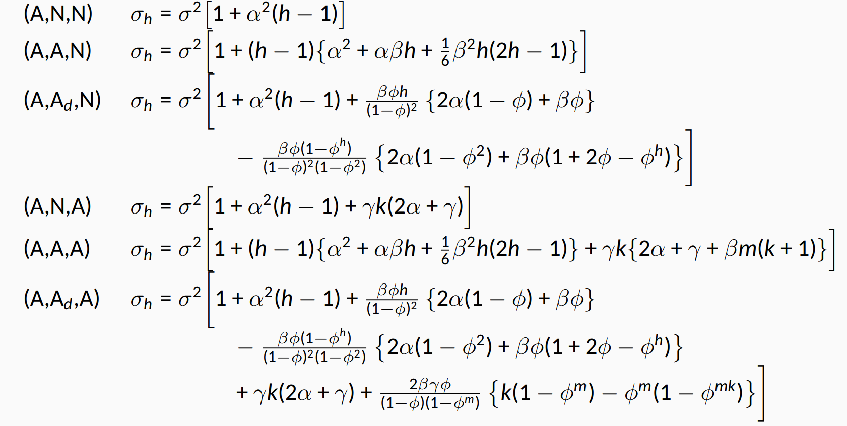 Для ETS моделей стандартне відхилення розраховується залежно від моделі, наприклад: