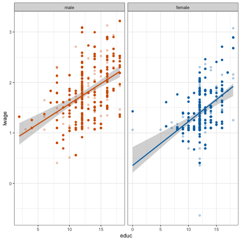 --- # Reading a regression table .center[ <img src="reg_inference_files/figure-html/reg_table.png" width="500px" style="display: block; margin: auto;" /> ] * Each column corresponds to a regression. For the first regression we have: * the **name of the outcome variable** in <span style="color: #2F528F;">blue</span> * the **estimated coefficient associated to being in a small class** `\(\hat{\beta_\textrm{small}}\)` in <span style="color: #70AD47;">green</span> * its **estimated standard error** in <span style="color: #FFC000;">yellow</span> * the **number of observations** in <span style="color: #7030A0;">purple</span> * the **R-squared** in <span style="color: #C00000;">red</span> * interpretation of the stars at the bottom --- layout: false class: title-slide-section-red, middle # Classical Regression Model --- # Classical Regression Model * Whether the inference is made from theory or simulations, some assumptions have to be met for this inference to be valid. * The set of assumptions needed defines the *Classical Regression Model* (CRM). * Before delving into these assumptions, let's see the small but important modifications we apply to our model (back to [*lecture SLR*](https://raw.githack.com/adamsoliman/IntroEconometrics/master/chapter_slr/chapter_slr.html)): * We already mentioned the distinction between the sample estimate `\(b_k\)` (or `\(\hat{\beta_k}\)`) and the population parameter `\(\beta_k\)`. * In the same way, we distinguish `\(e\)`, the sample error (*residual*), from `\(\varepsilon\)`, the error term from the true population model: `$$y_i = \beta_0 + \beta_1 x_{1,i} + ... + \beta_k x_{k,i} + \varepsilon_i$$` * The classical regression model applies to **correctly specified linear regressions**: the model needs to be linear in parameters, include all relevant variables, and variables cannot be collinear. --- # CRM Assumptions 1. ***Mean Independence:*** the mean of the residuals conditional on `\(x\)` should be zero, `\(E[\varepsilon|x] = 0\)`. Notice that this also means that `\(Cov(\varepsilon,x) = 0\)`, i.e. that the errors and our explanatory variable(s) should be *uncorrelated*. * Violating this assumption will lead to **biased** estimates of `\(\beta_k\)`. --- # Mean Independence of Error: E[u | small] = ? <img src="reg_inference_files/figure-html/unnamed-chunk-24-1.svg" style="display: block; margin: auto;" /> --- # Mean Independence of Error: E[u | small] = ? <img src="reg_inference_files/figure-html/unnamed-chunk-25-1.svg" style="display: block; margin: auto;" /> --- # Exogeneity Assumption The CRM assumption #1 is also know as the (strict) **exogeneity assumption**. * When this assumption is violated our estimate `\(b\)` will be a ***biased*** estimate of `\(\beta\)`, i.e. `\(\mathop{\mathbb{E}}[b] \neq \beta\)` -- * For example, imagine you are interested in the effect of education on wage `$$\text{wage}_i = \beta_0 + \beta_1 \text{education}_i + \varepsilon_i$$` * Under the exogeneity assumption `\(\beta_1\)` denotes the causal effect of education in the population. -- * Suppose there is *unobserved* ability `\(a_i\)`. * High ability means higher wage. * It *also* means school is easier, and so `\(i\)` selects into more schooling. --- # Exogeneity Assumption * Given ability is *unobserved*, `\(a_i\)` goes into the error `\(\varepsilon_i\)` -- * Our *ceteris paribus* assumption (all else equal) does not hold. -- * Then regressing the wage on education we will attribute to `education` part of the effect on wages that is actually *caused* by ability `\(a_i\)`! -- * Remember the formula of the **omitted variable bias**: `$$\text{OVB} = \text{multiple regression coefficient on omitted variable} \times \frac{Cov(x,z)}{Var(x)}$$` -- * Thus, we have: $$ \mathbb{E}(b_1) = \beta_1 + OVB > \beta_1$$ * *Interpretation*: taking repeated sample from the population and computing `\(b_1\)` each time, we would **systematically overestimate** the effect of education on wage. --- # CRM Assumptions 1\. ***Mean Independence:*** the mean of the residuals conditional on `\(x\)` should be zero, `\(E[\varepsilon|x] = 0\)`. Notice that this also means that `\(Cov(\varepsilon,x) = 0\)`, i.e. that the errors and our explanatory variable(s) should be *uncorrelated*. * Violating this assumption will lead to **biased** estimates of `\(\beta_k\)`. -- 2\. ***Independently and identically distributed:*** data drawn from a **random sample** of size `\(n\)`: observation `\((x_i,y_i)\)` comes from the exact same distribution, and is **independent** of observation `\((x_j,y_j)\)`, for all `\(i\neq j\)`. * Violating this assumption would make your sample less representative of the underlying population. It will lead to **biased** estimates of `\(\beta_k\)`. -- 3\. ***Homoskedasticity:*** the variance of the error term `\(\varepsilon\)` is the same for each value of `\(x\)`: `\(Var(\varepsilon|x) = \sigma^2\)`. * If this assumption is violated, you can still obtain unbiased estimates of `\(\beta_k\)`. However your estimate of `\(\hat{\textrm{SE}}(b_k)\)` will be biased, which will affect your test statistic and p-value. -- 4\. ***Normally distributed errors:*** the error term is normally distributed, i.e. `\(\varepsilon \sim \mathcal{N}(0,\sigma^2)\)` * Not strictly necessary, but makes inference possible even with small sample sizes. 👉 Takeaway: **if assumptions violated, inference is invalid!** --- # Illustrating Uncertainty .pull-left[ Let's repeat the procedure you just made 100 times! ``` r library(AER) data("CPS1985") cps = CPS1985 %>% mutate(log_wage = log(wage)) set.seed(1) bootstrap_sample = cps %>% rep_sample_n(size = nrow(cps), reps = 100, replace = TRUE) ggplot(data=cps,aes(y = log_wage, x = education, colour = gender)) + geom_point(size = 1, alpha = 0.7) + geom_smooth(method = "lm", alpha = 2) + geom_smooth(data=bootstrap_sample, size = 0.2, aes(y = log_wage, x = education, group = replicate), method = "lm", se = FALSE) + facet_wrap(~gender) + scale_colour_manual(values = c("darkb