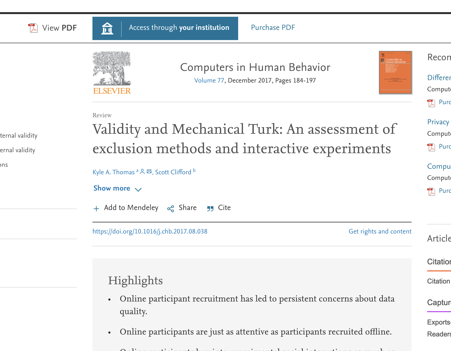 “Validity and Mechanical Turk: An Assessment of Exclusion Methods and Interactive Experiments.” Computers in Human Behavior 77 (December): 184–97.