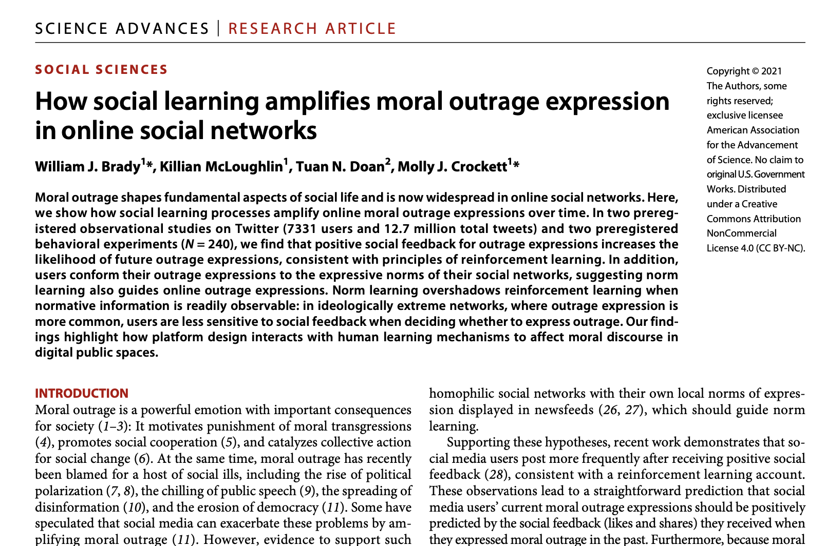 “How Social Learning Amplifies Moral Outrage Expression in Online Social Networks.” Science Advances 7 (33).