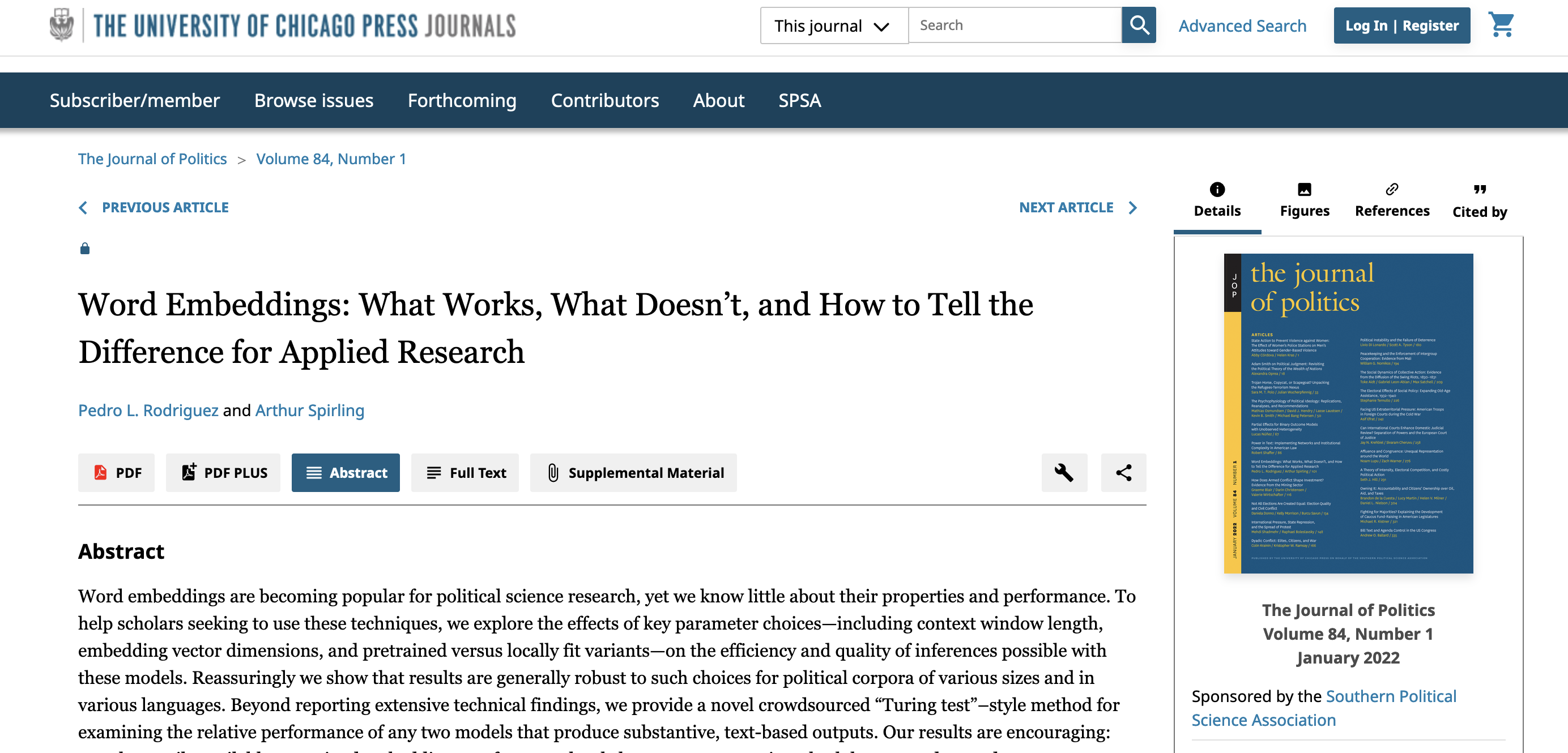 “Word Embeddings: What Works, What Doesn’t, and How to Tell the Difference for Applied Research.” The Journal of Politics 84 (1): 101–15.