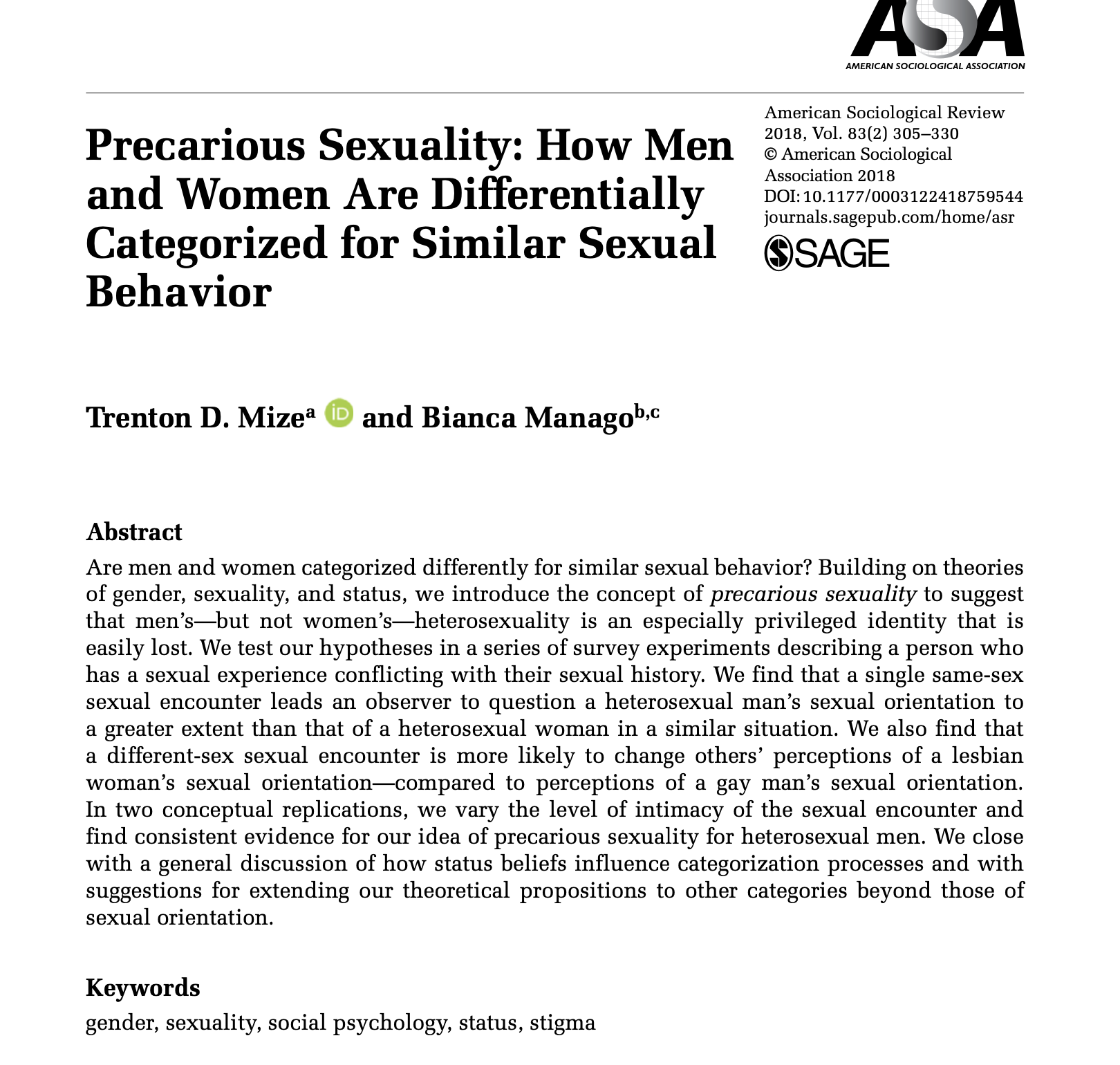 “Precarious Sexuality: How Men and Women Are Differentially Categorized for Similar Sexual Behavior.” American Sociological Review 83 (2): 305–30.
