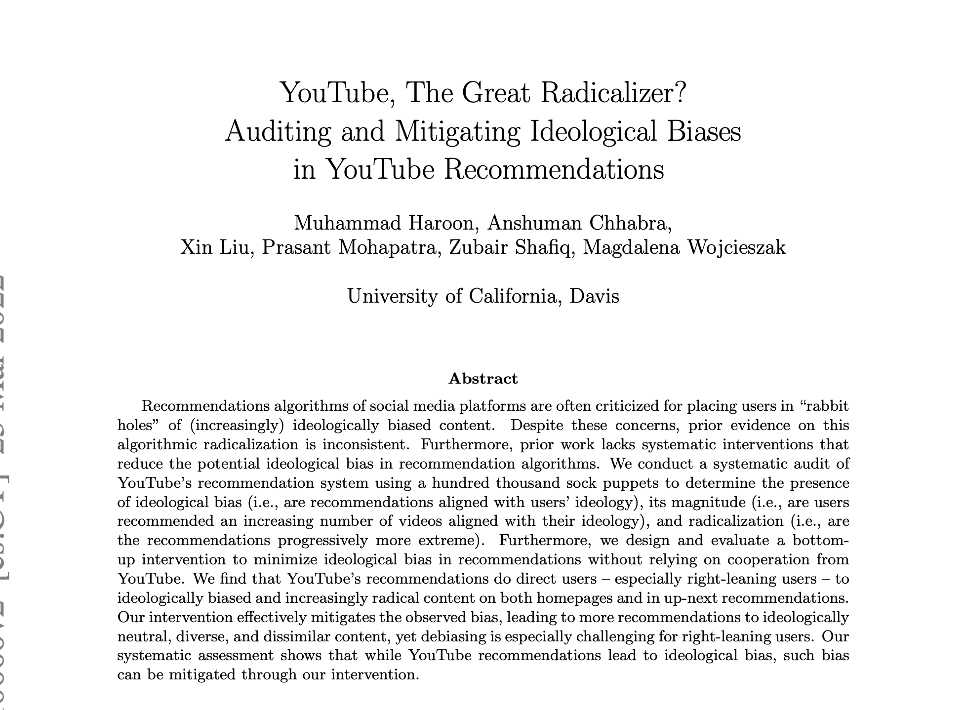 “YouTube, the Great Radicalizer? Auditing and Mitigating Ideological Biases in YouTube Recommendations.” https://doi.org/10.48550/ARXIV.2203.10666.