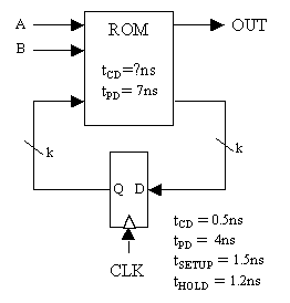 - Assume that the ROMʼs \(t_{\textrm{CD}} = 3\textrm{ns}\). What is the shortest possible clock period that still ensures that the necessary timing specifications are met?