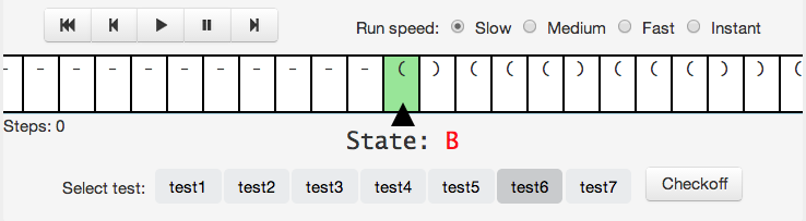 Use the TMSim simulator below to enter your design in the "Paren Checker" tab. The initial contents of the tab are a sequence of test tapes which must be processed successfully by your TM. To run the tests, click "TMSim Assemble" and then "Checkoff". If all the tests pass, then clicking will give you credit for completing this problem. Please see the note on scoring at the end of this problem.