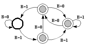 Shown below is a state transition diagram for an FSM, F, with a single binary input B. The FSM has a single output, a light which is on for the three states marked by a gray dot. The starting state is marked by the heavy circle.