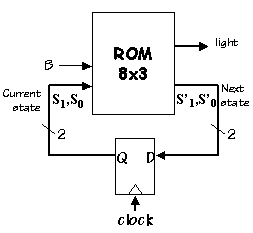 It is known that the starting state of the 4-state FSM corresponds to 00 on the state variable input, and the light output is 1 when the light is to be on. What is the value of the light output when all three inputs to the ROM are zero?