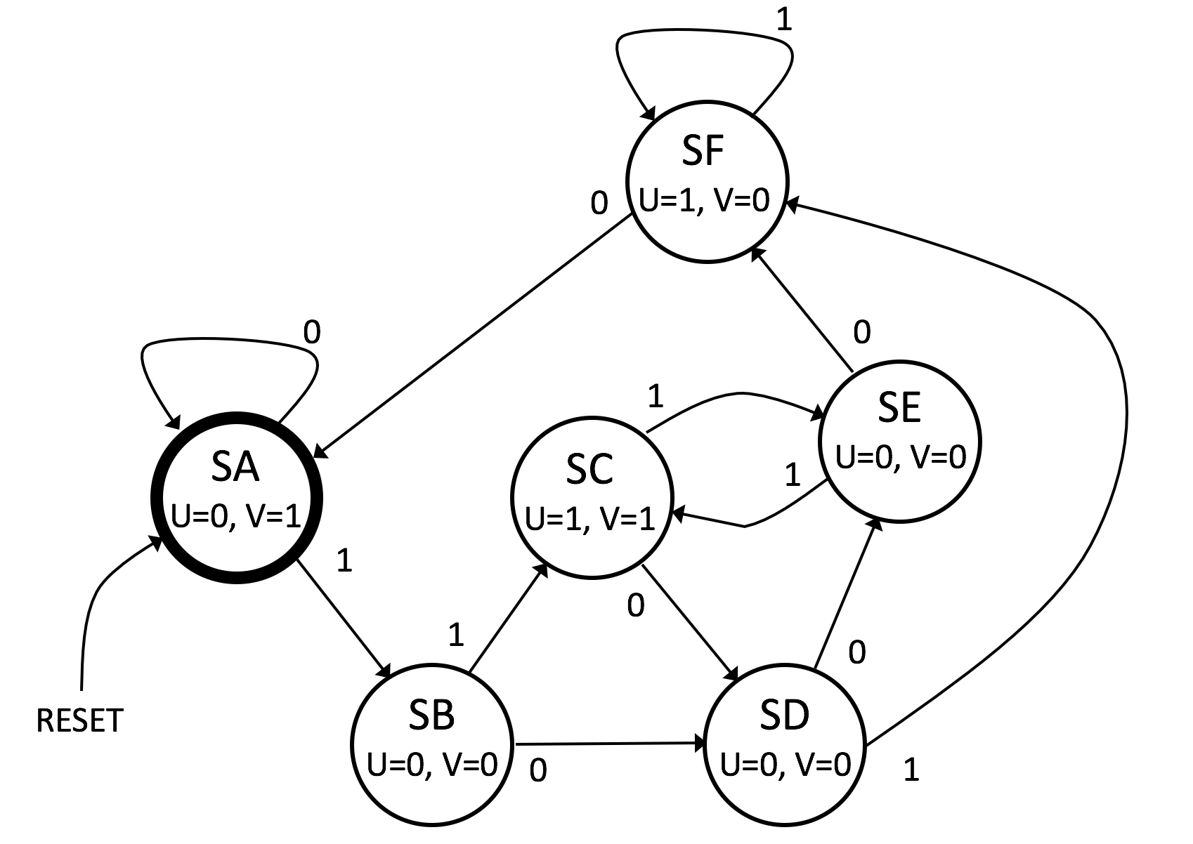 The values of the two outputs, U and V, are determined by the current state and are as shown in the state transition diagram.