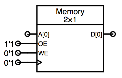 To build a ROM, set the memory component to have a single port with the desired number of address inputs and data outputs. Connect its CLK and WE inputs to 0ʼ1, which will disable the ability to write into the memory, making it read-only. And connect its OE input to 1ʼ1 which will enable the D outputs: