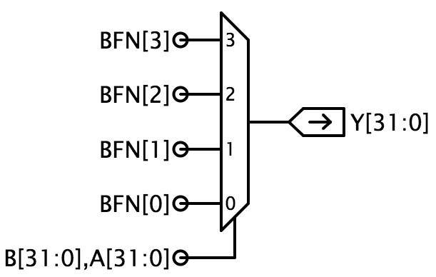 The suggested implementation uses 32 copies of a 4-to-1 multiplexor (mux4) where BFN[3:0] encode the operation to be performed and A[31:0] and B[31:0] are hooked to the multiplexorʼs select inputs. This implementation can produce any of the 16 2-input Boolean functions.