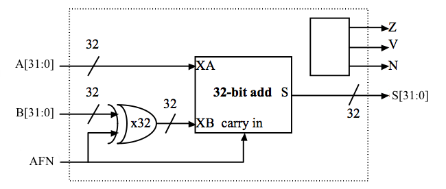 AFN will be set to 0 for an ADD (\(S = A+B\)) and 1 for a SUBTRACT (\(S = A-B\)); A[31:0] and B[31:0] are the 32-bit twoʼs complement input operands; S[31:0] is the 32-bit result; Z/V/N are the three condition code bits described above. Weʼll be using the "little-endian" bit numbering convention where bit 31 is the most-significant bit and bit 0 is the least-significant bit.