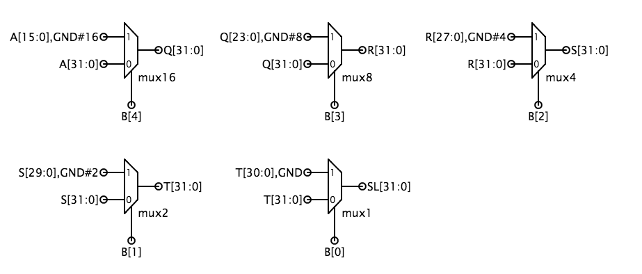 The simplest implementation is to build two shifters — one for shifting left and one for shifting right — and then use a 2-way 32-bit multiplexer to select the appropriate answer as the moduleʼs output. Itʼs easy to build a shifter after noticing that a multi-bit shift can be accomplished by cascading shifts by various powers of 2. For example, a 13-bit shift can be implemented by a shift of 8, followed by a shift of 4, followed by a shift of 1. So the shifter is just a cascade of multiplexers each controlled by one bit of the shift count. The schematic below shows a possible implementation of the left shift logic; the right shift logic is similar with the slight added complication of having to shift in either 0 (i.e., "gnd") or A[31], depending on the value of SFN[1]. Another approach that saves gates is to use the left shift logic for both left and right shifts, but for right shifts, reverse the bits of the A operand on the way in and reverse the bits of the output on the way out.