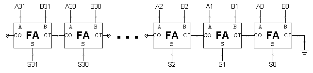 Clearly, testing a 32-bit adder by trying all combinations of input values isnʼt a good plan! Shown below is a schematic for a 32-bit ripple-carry adder.