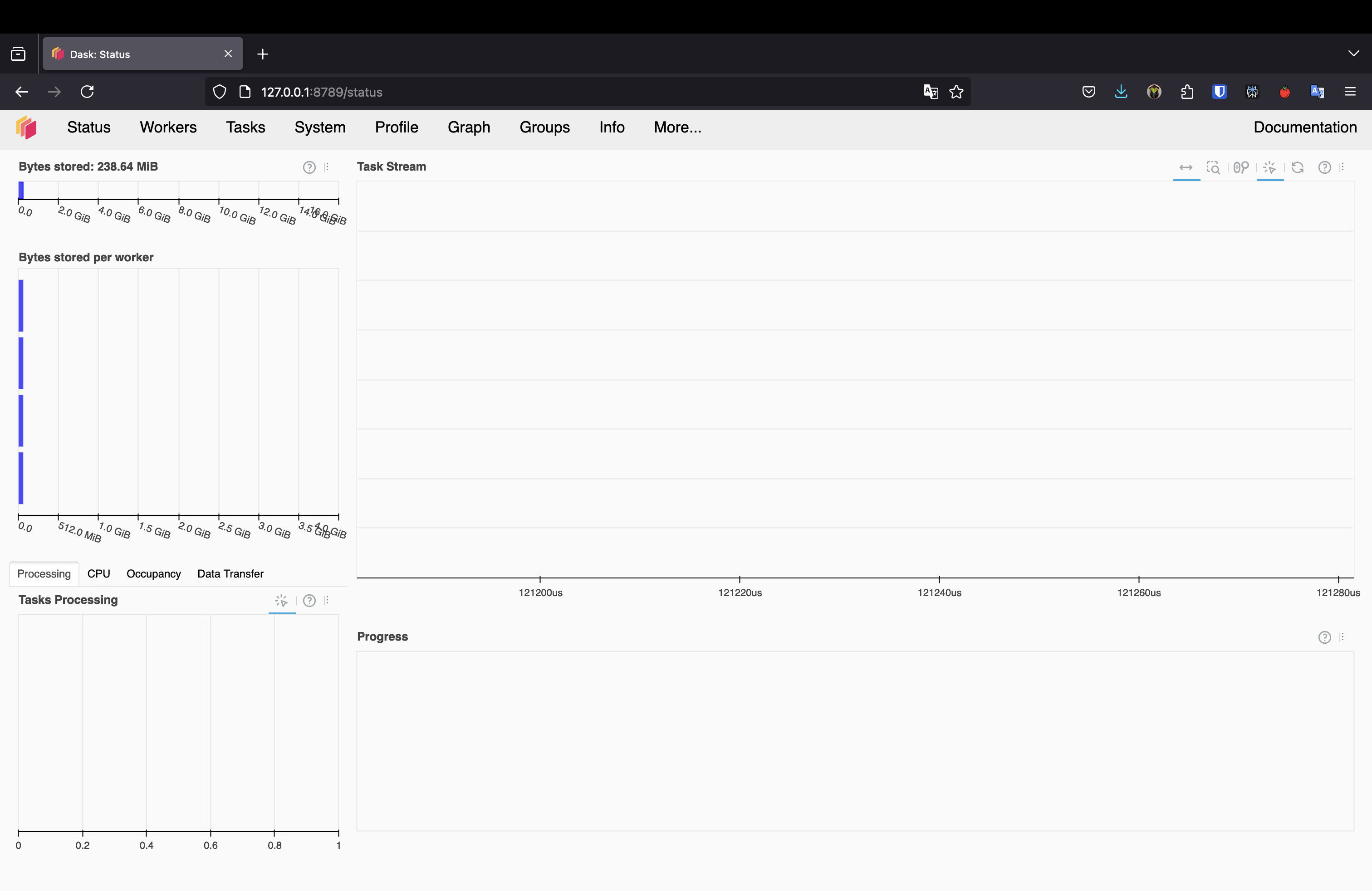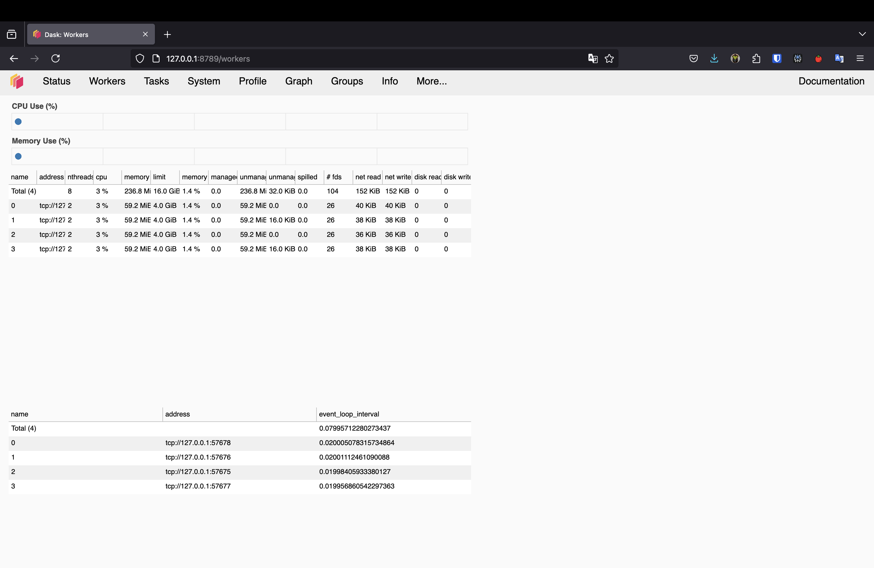 from dask.distributed import LocalCluster, Client# Specify a different port for the dashboard# Use fewer workers and threads to avoid resource issuescluster = LocalCluster(dashboard_address=':8789', n_workers=2, threads_per_worker=2)client = Client(cluster)# Print the dashboard linkprint(f"Dask dashboard is available at: {cluster.dashboard_link}")
