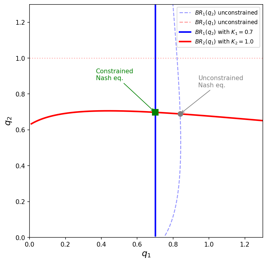 Without constraints, the Nash equilibrium is \((q_1^*, q_2^*) \approx (0.84, 0.69)\)