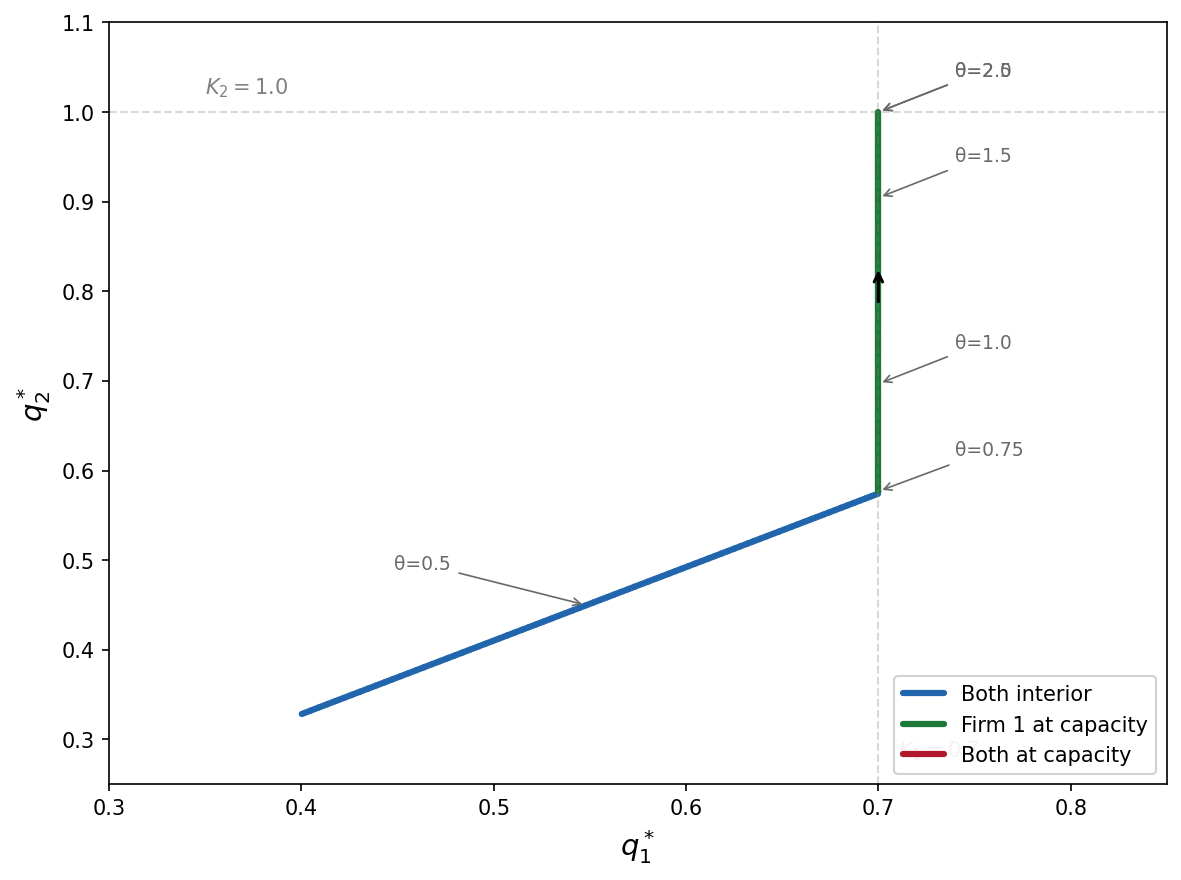 As \(\theta\) rises, both firms want to produce more. Three regimes emerge: