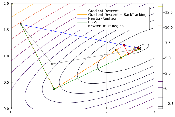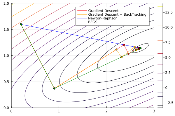 Once again, we will use Optim.jl. We’ll see an example with an easy function, solving it using Steepest Descent, Newton-Raphson, and BFGS