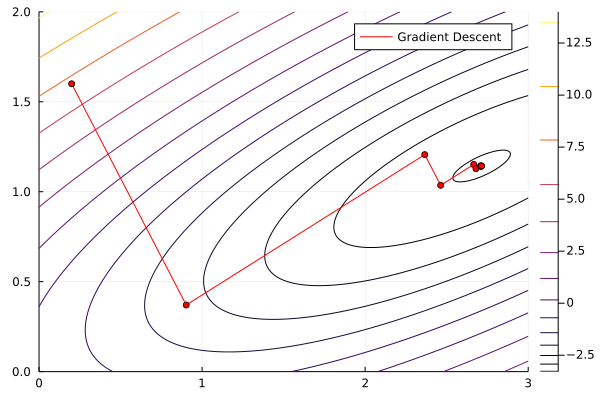 res_GD = Optim.optimize(f, g!, x0, GradientDescent(), Optim.Options(x_abstol=1e-3)) * Status: success