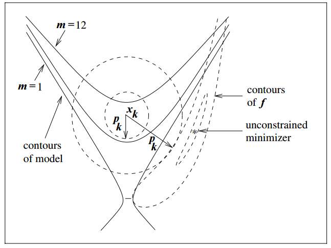 Trust region methods construct an approximating model, m_k whose behavior near the current iterate x_k is close to that of the actual function f
