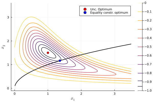 @constraint(my_model_eqcon, -x_1 + x_2^2 == 0);print(my_model_eqcon)\begin{aligned} \min\quad & \textsf{-}\left({\textsf{exp}\left({{\textsf{-}\left({{\left(x\_1\times x\_2 - 1.5\right)} ^ {2}}\right)} - {\left(x\_2^2 - 3 x\_2 + 2.25\right)}}\right)}\right)\\ \text{Subject to} \quad & x\_2^2 - x\_1 = 0\\ & x\_1 \geq 0\\ & x\_2 \geq 0\\ \end{aligned}