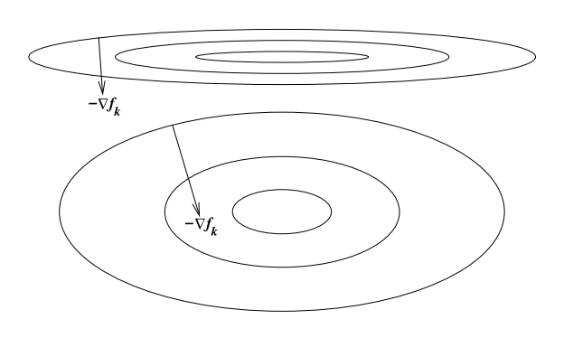 A problem is poorly scaled if changes to x in a certain direction produce much bigger changes in f than changes to in x in another direction
