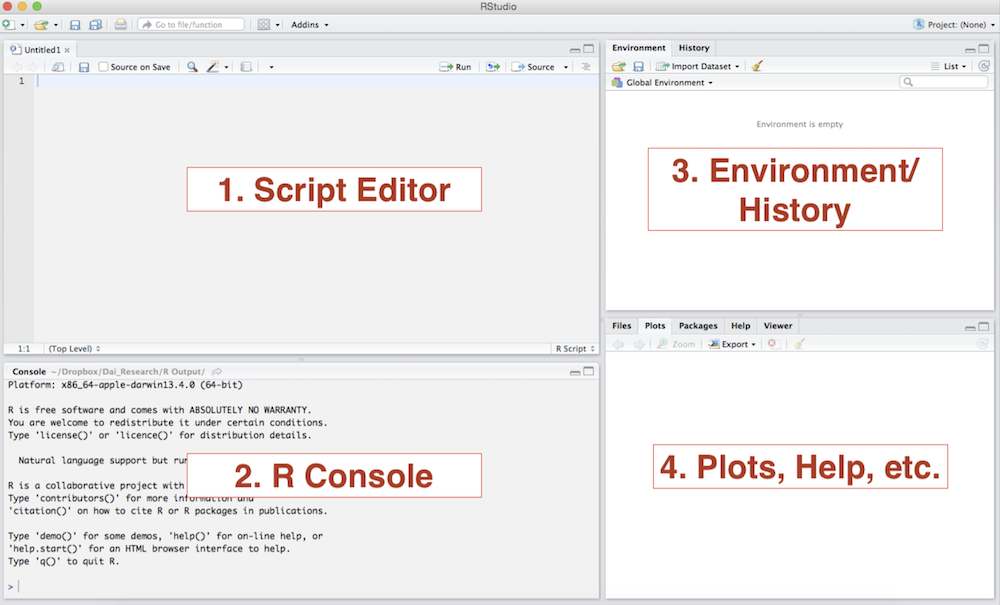 Plots and files: This area will be where graphic output will be generated. Additionally, if you write a question mark before any function, (i.e.Β ?mean) the online documentation will be displayed here.