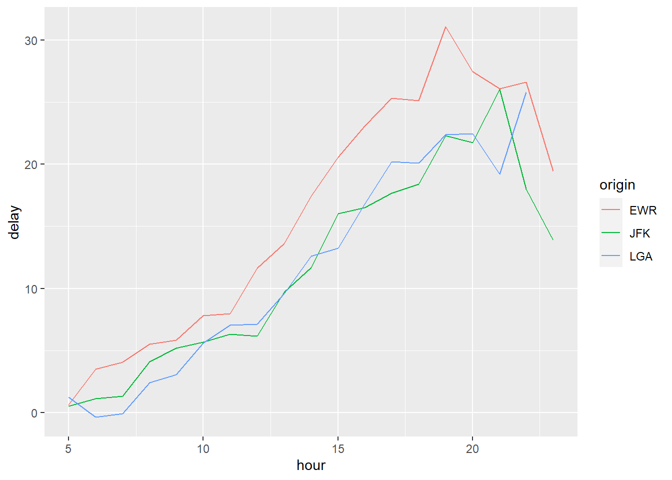 ggplot(aes(hour, delay, color = origin)) + geom_line()