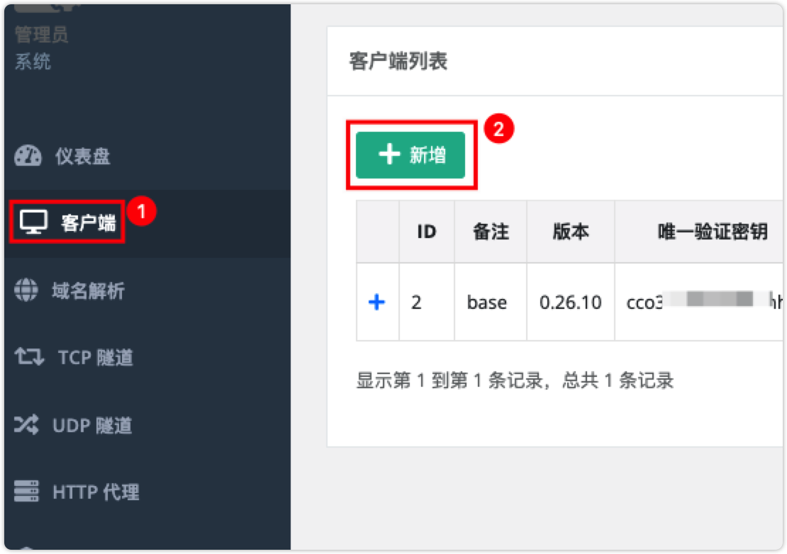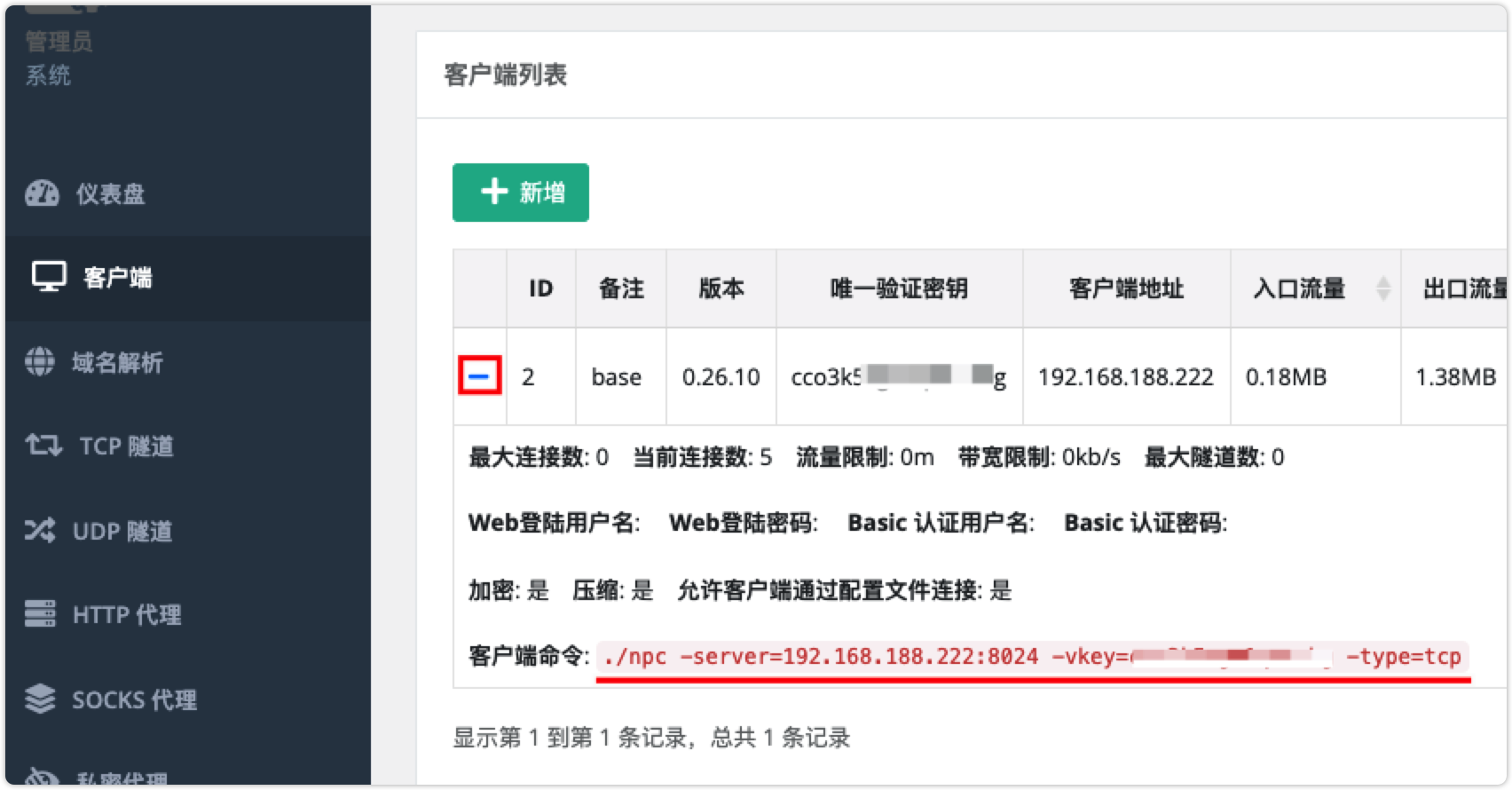 注意:客户端命令 ./npc -server=150.106.195.110:8024 -vkey=<唯一验证密钥> -type=tcp 中的 唯一验证密钥 用于客户端安装需要使用