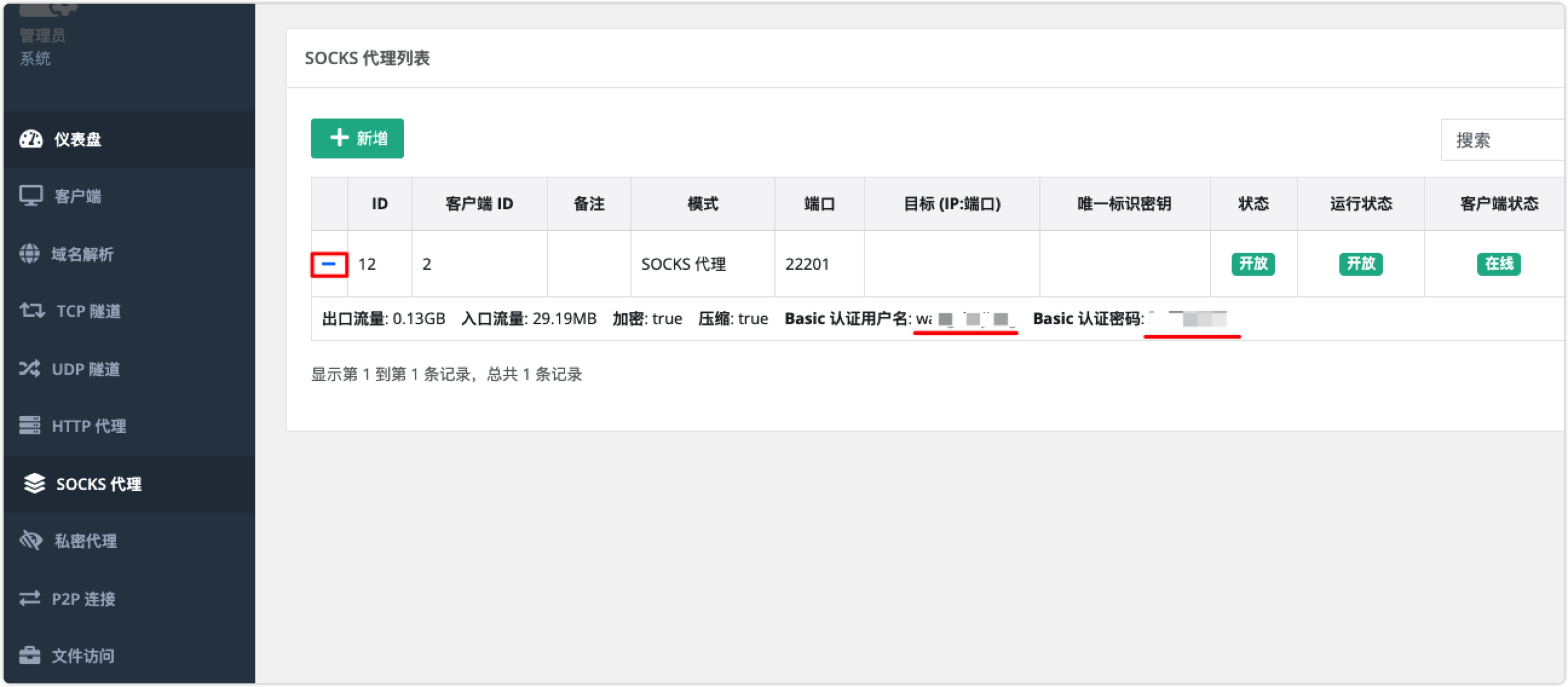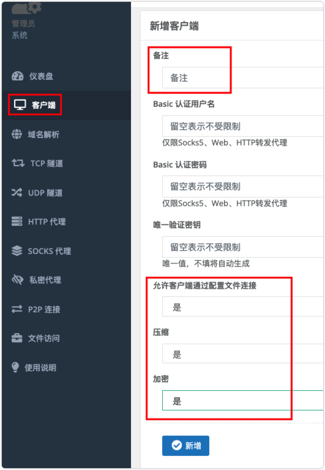 使用用户名和密码登陆(默认admin/123,正式使用一定要更改,修改 /opt/nps/conf/nps.conf 配置文件中的 web_password),也可以在这里配置更改默认控制台管理平台端口(web_port = 8666),通道端口更改 bridge_port=8024