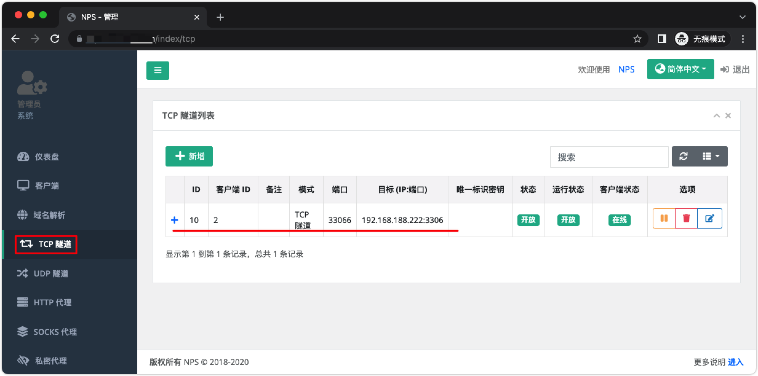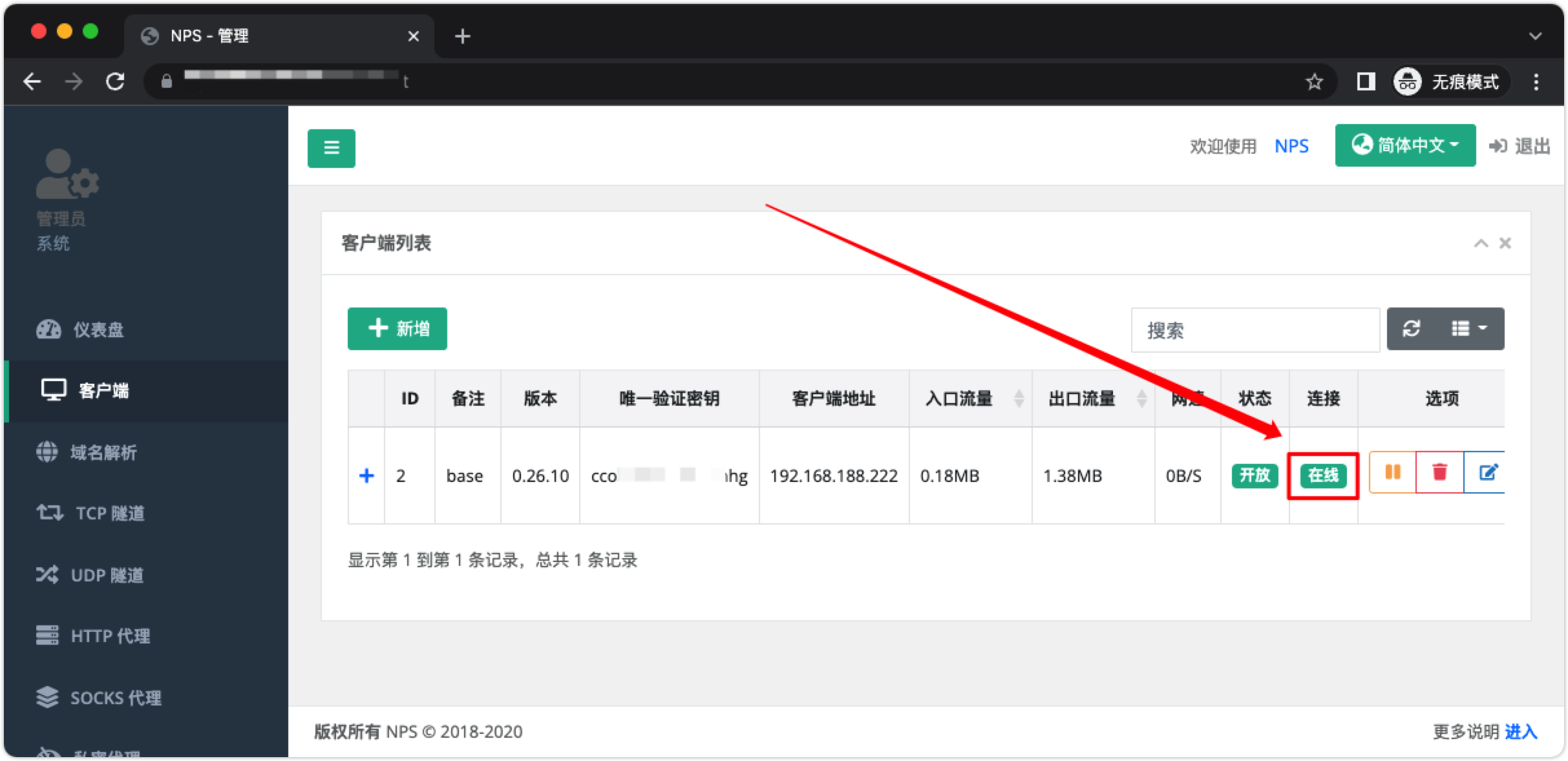 服务运行起来,这样客户端就连接到了 NPS 的服务端了