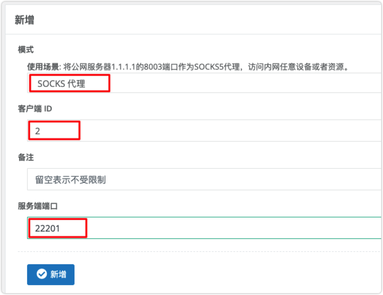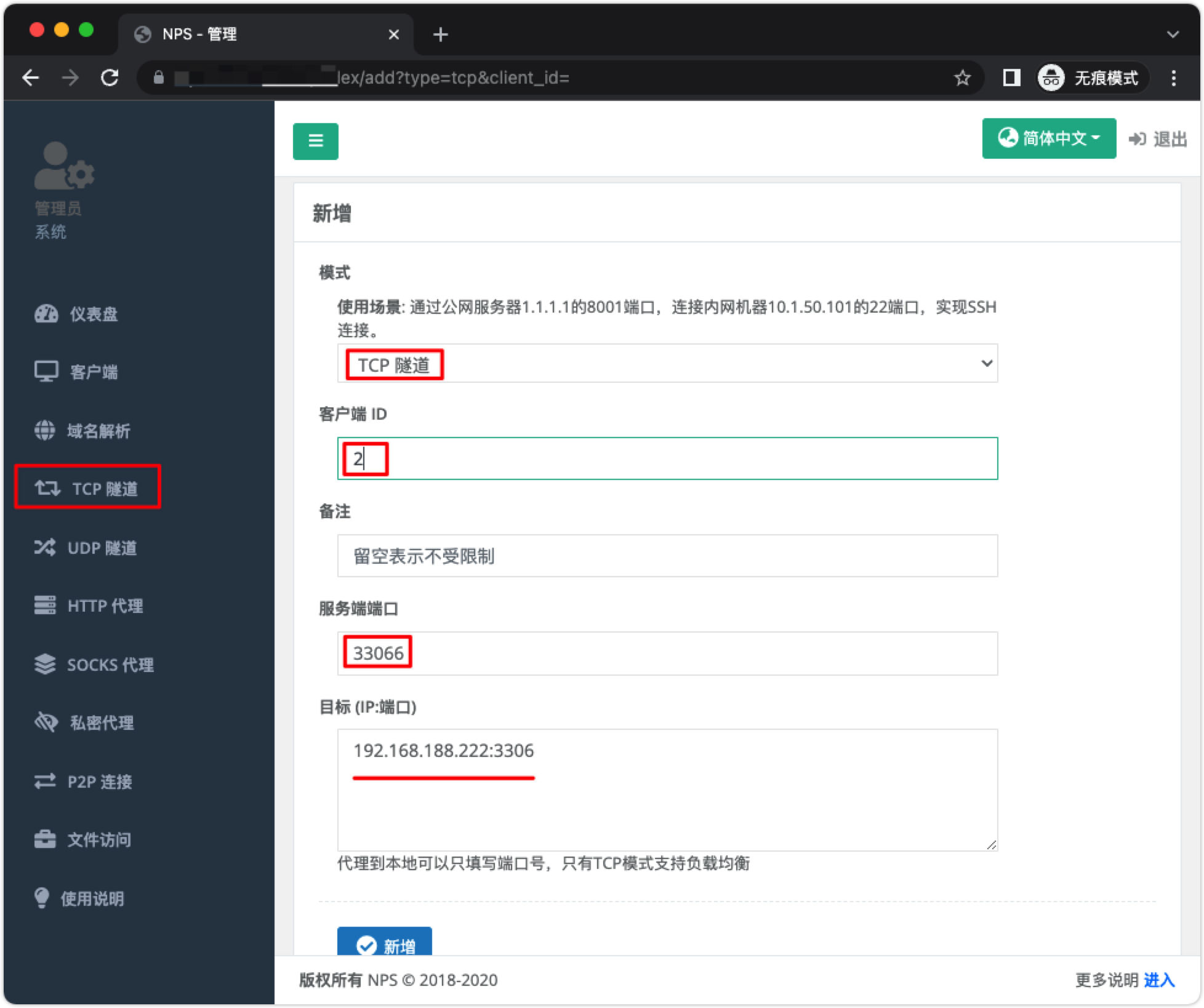 假设我们要穿透局域网 MySQL 数据库,在 目标 (IP:端口) 配置内网 MySQL IP:端口 192.168.188.222:3306,在外网访问的端口 服务端端口 配置 33066
