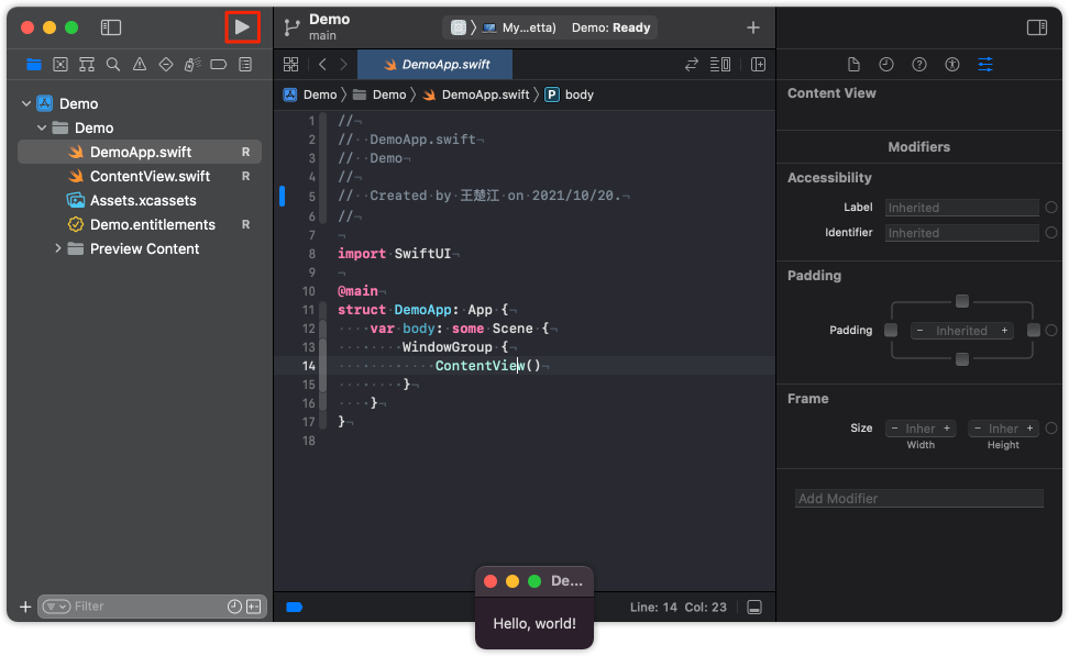 现在你可以点击 ▶︎ 运行起来,也可以通过快捷键 ⌘ + r