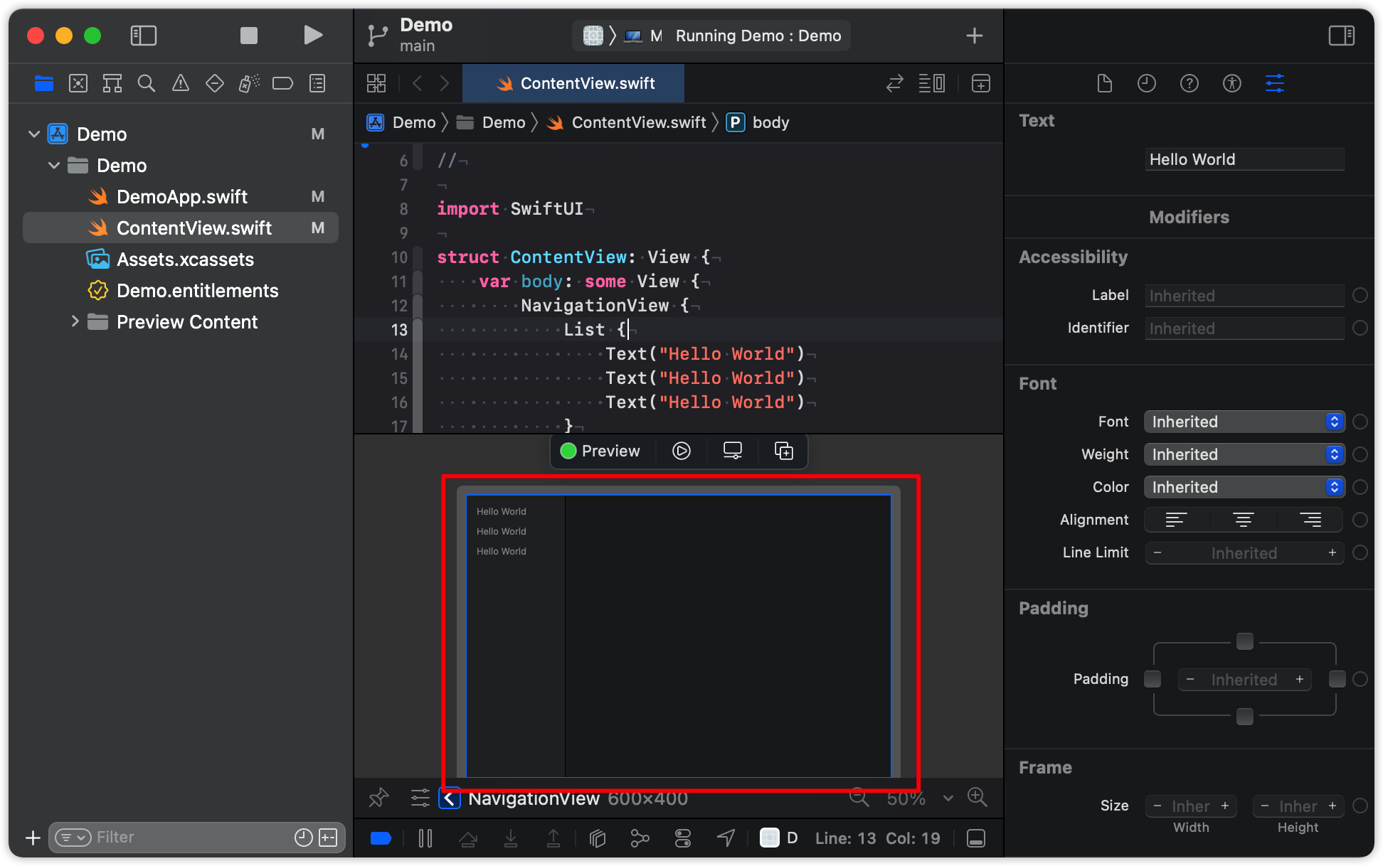 Xcode 为我们创建的基本内容视图是一个单独的文本视图,上面写着 Hello World,并带有一些填充-多余的边距阻止了我们添加的任何其他视图之间的距离过近。 在我们的应用程序中,这实际上将向我们显示菜单中的项目列表,因此我们将改用列表视图。