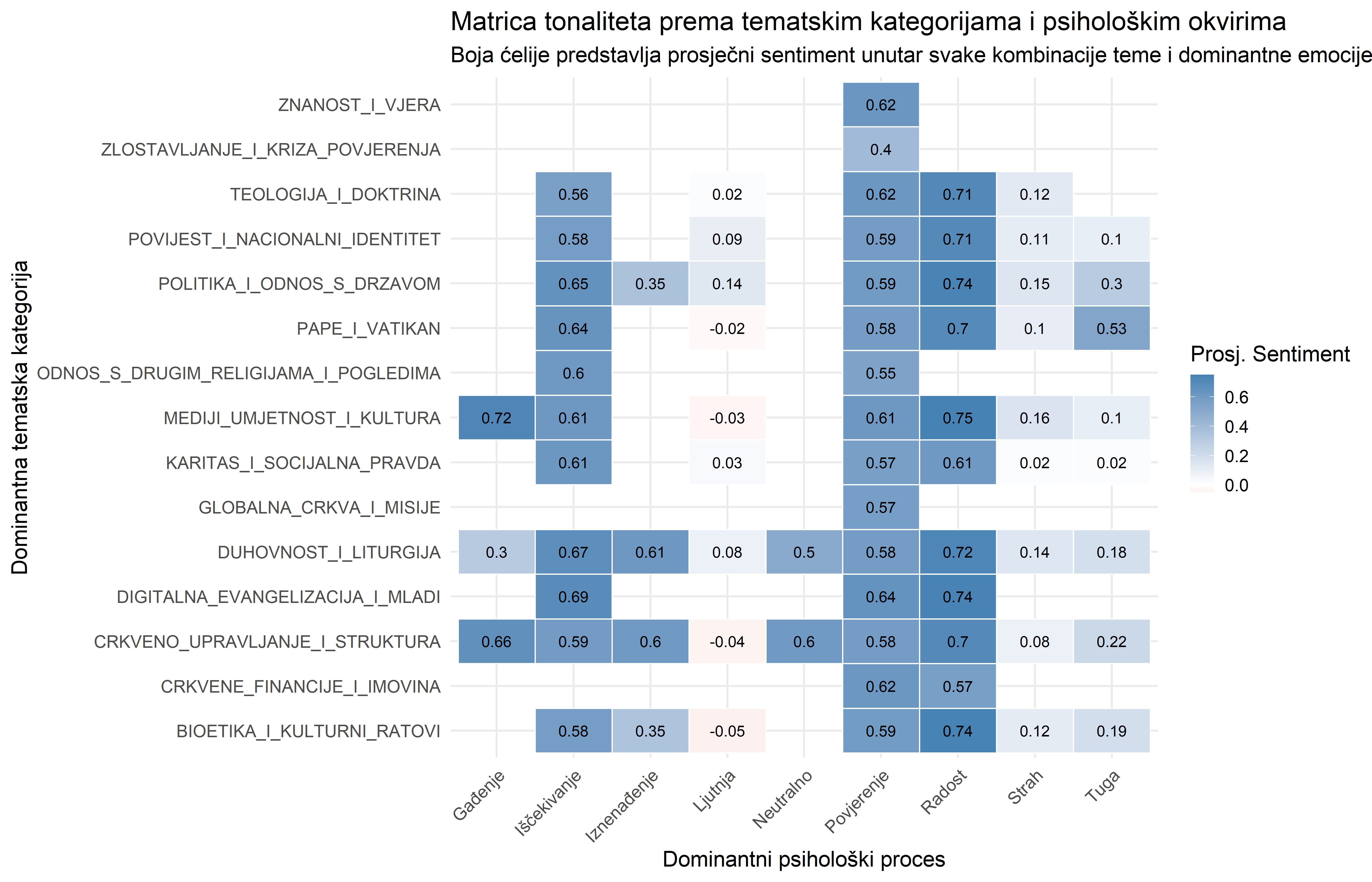 Paradoksalna uloga emocije Gađenja. Analiza otkriva fascinantnu asimetriju. Kada je Gađenje usmjereno prema temi Politike i odnosa s državom, najvjerojatnije u kontekstu kritike političke korupcije ili nemoralnosti, rezultira pozitivnim sentimentom koji signalizira moralnu osudu. Međutim, kada je ista emocija usmjerena prema temi Pape i Vatikana, u kontekstu unutarcrkvenih skandala ili problema, generira najnegativniji sentiment u cijeloj matrici.