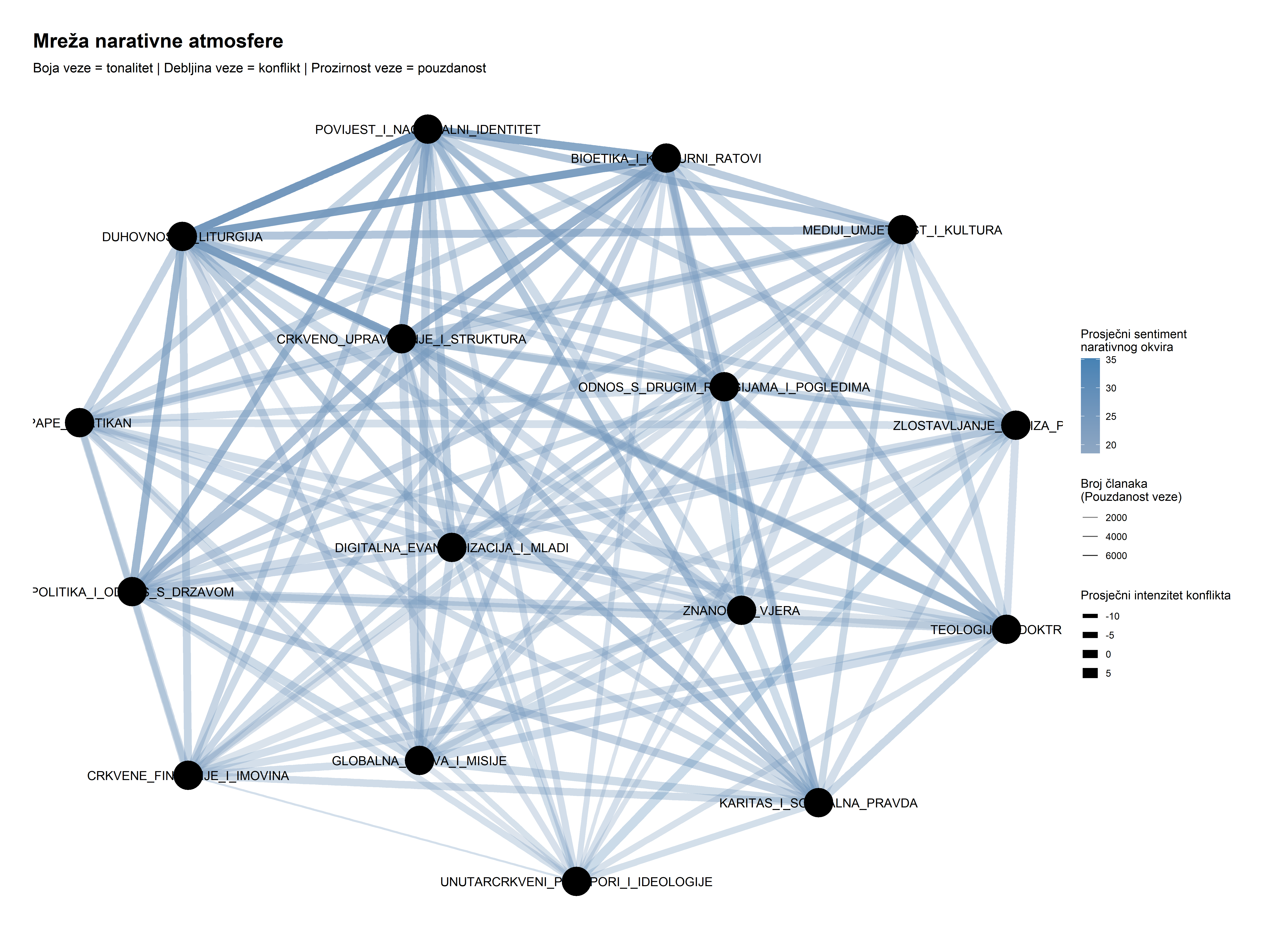 Konfliktni jezik kao primarni diferencijator narativnih okvira. Iznenađujući je gotovo potpun nedostatak negativno obojenih veza u mreži. To ne implicira odsutnost kritičkog diskursa, već sugerira da intenzitet konfliktnog jezika, vizualiziran debljinom veze, predstavlja važniju dimenziju razlikovanja narativa od tonaliteta. Najdeblje i najtamnije linije, koje predstavljaju najpouzdanije i najkonfliktnije narativne spojeve, jasno povezuju tematske kategorije Bioetike i kulturnih ratova, Politike i odnosa s državom, Pape i Vatikana te Povijesti i nacionalnog identiteta. Ovaj četverokut predstavlja primarno bojište narativnih prijepora gdje se odvijaju najintenzivnije medijske rasprave.