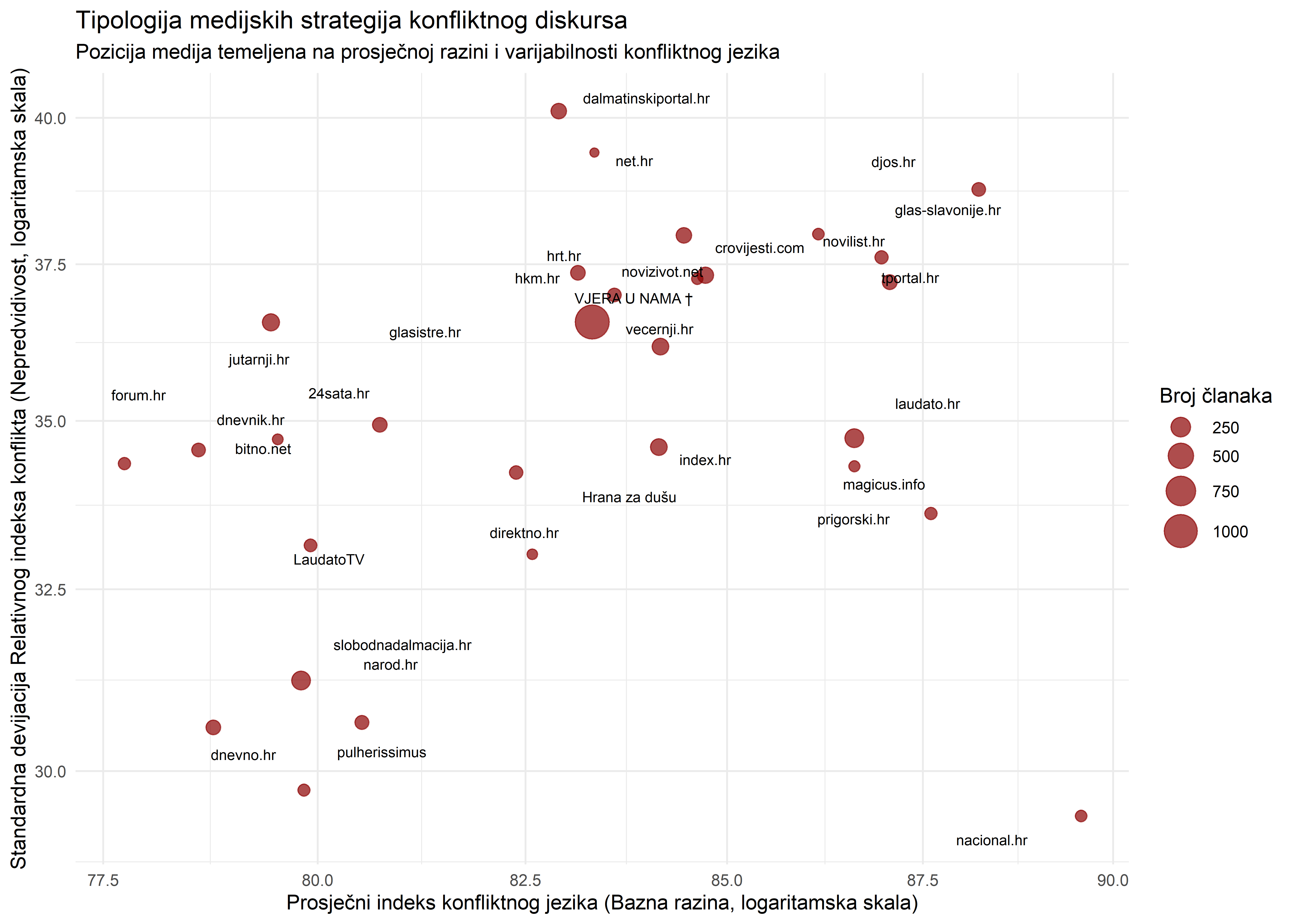 Sljedeći grafikon koristi RIK za identifikaciju i klasifikaciju medijskih strategija u korištenju konfliktnog jezika. Horizontalna os predstavlja prosječnu, baznu razinu konfliktnog jezika karakterističnu za svaki medij. Vertikalna os predstavlja varijabilnost u korištenju konfliktnog jezika, mjerenu standardnom devijacijom RCI vrijednosti. Veličina točke označava ukupnu prisutnost medija u korpusu.