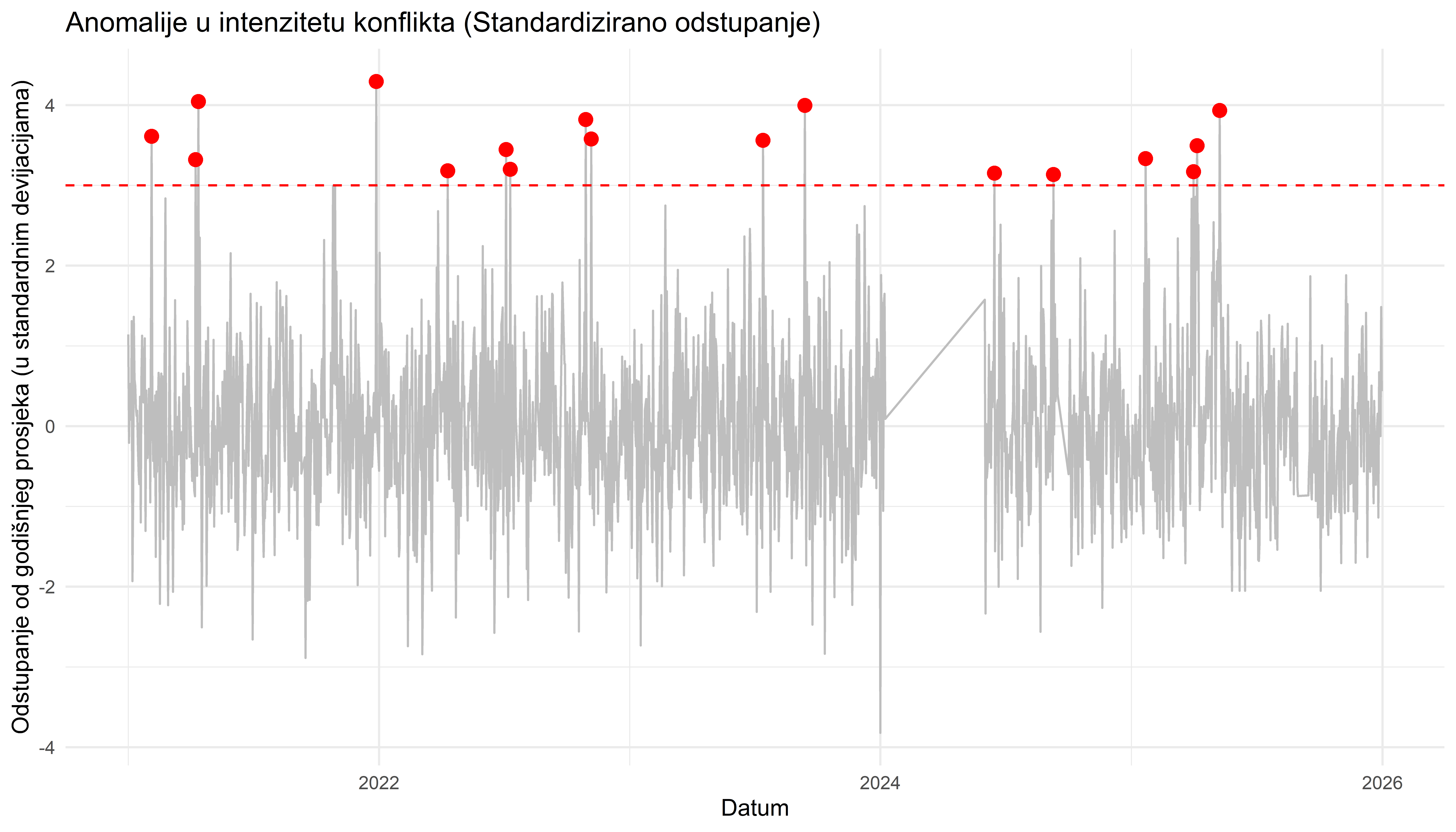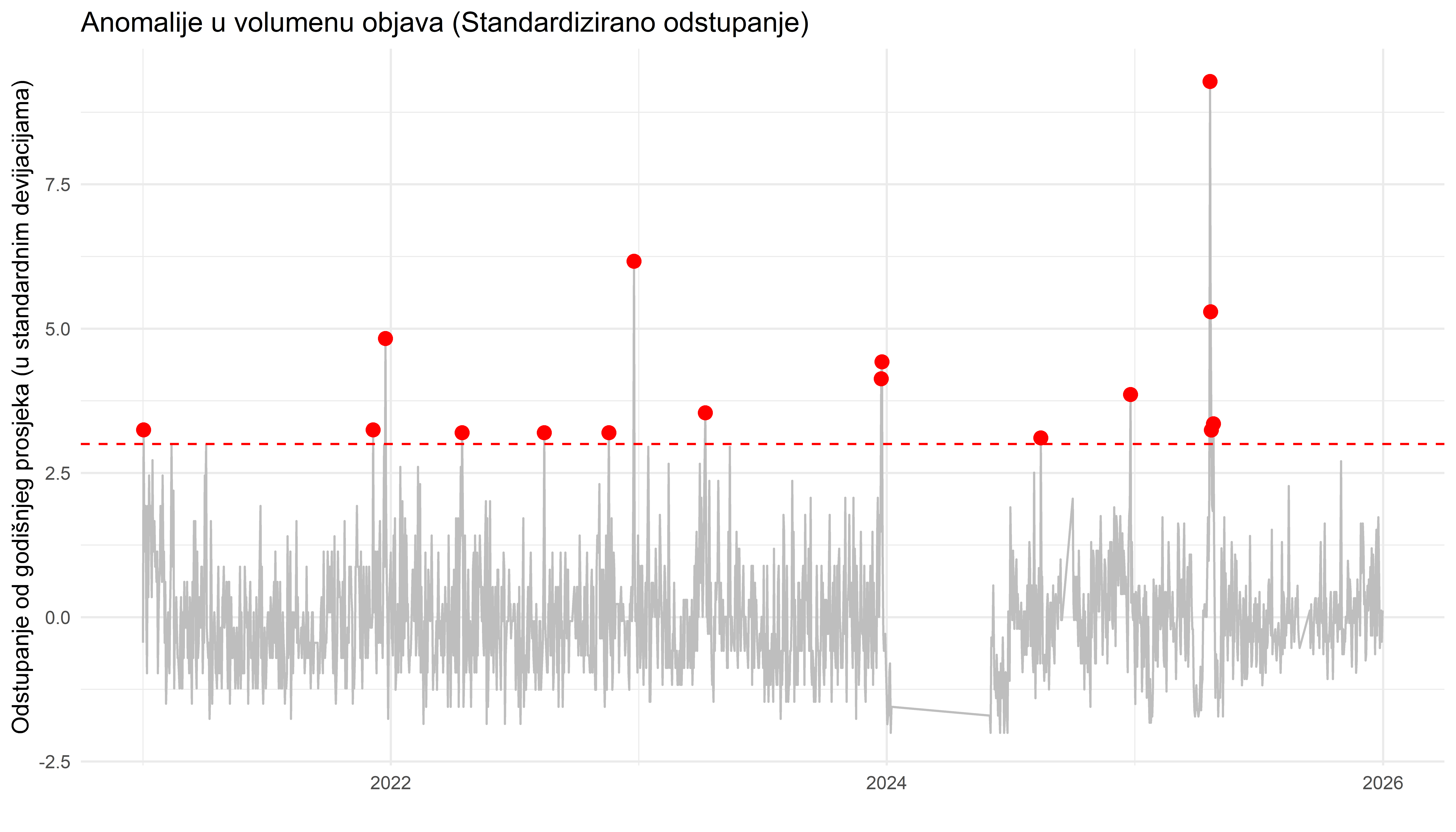 Crvene točke na vizualizacijama označavaju trenutke koji su uzburkali digitalni prostor, manifestirajući odstupanja od tri ili više standardnih devijacija od prosječne razine aktivnosti. Ove anomalije nisu stohastičke fluktuacije, već sustavno odgovaraju važnim društvenim, političkim i vjerskim događajima.