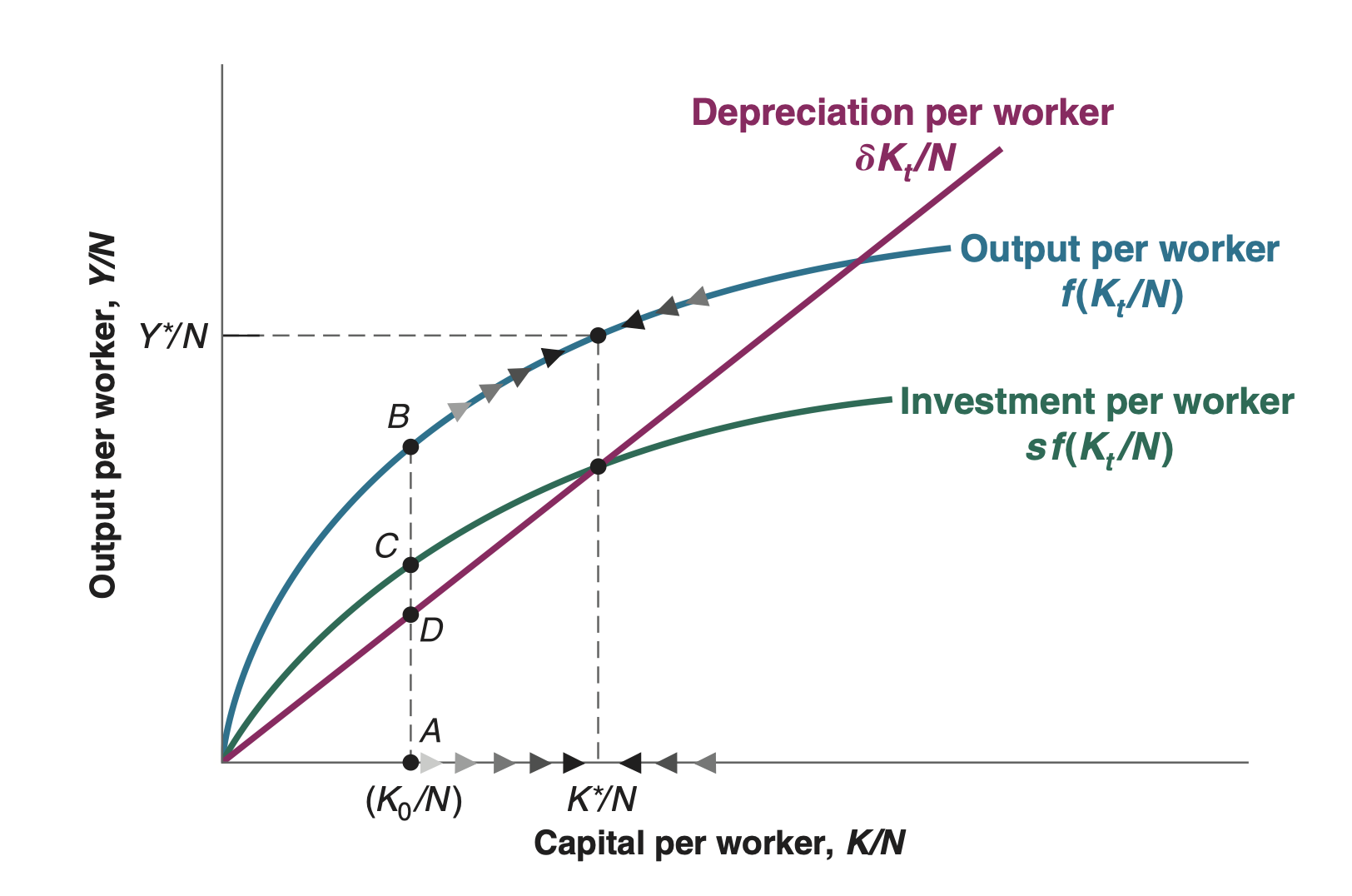 Last time, we derived two relations involving aggregate output per worker (Y/N) and an economy’s capital stock per worker (K/N):