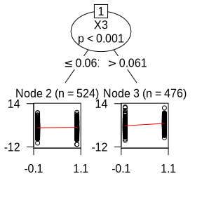 glmtr <- partykit::glmtree(as.formula(eqn), data = dat, family = "gaussian",