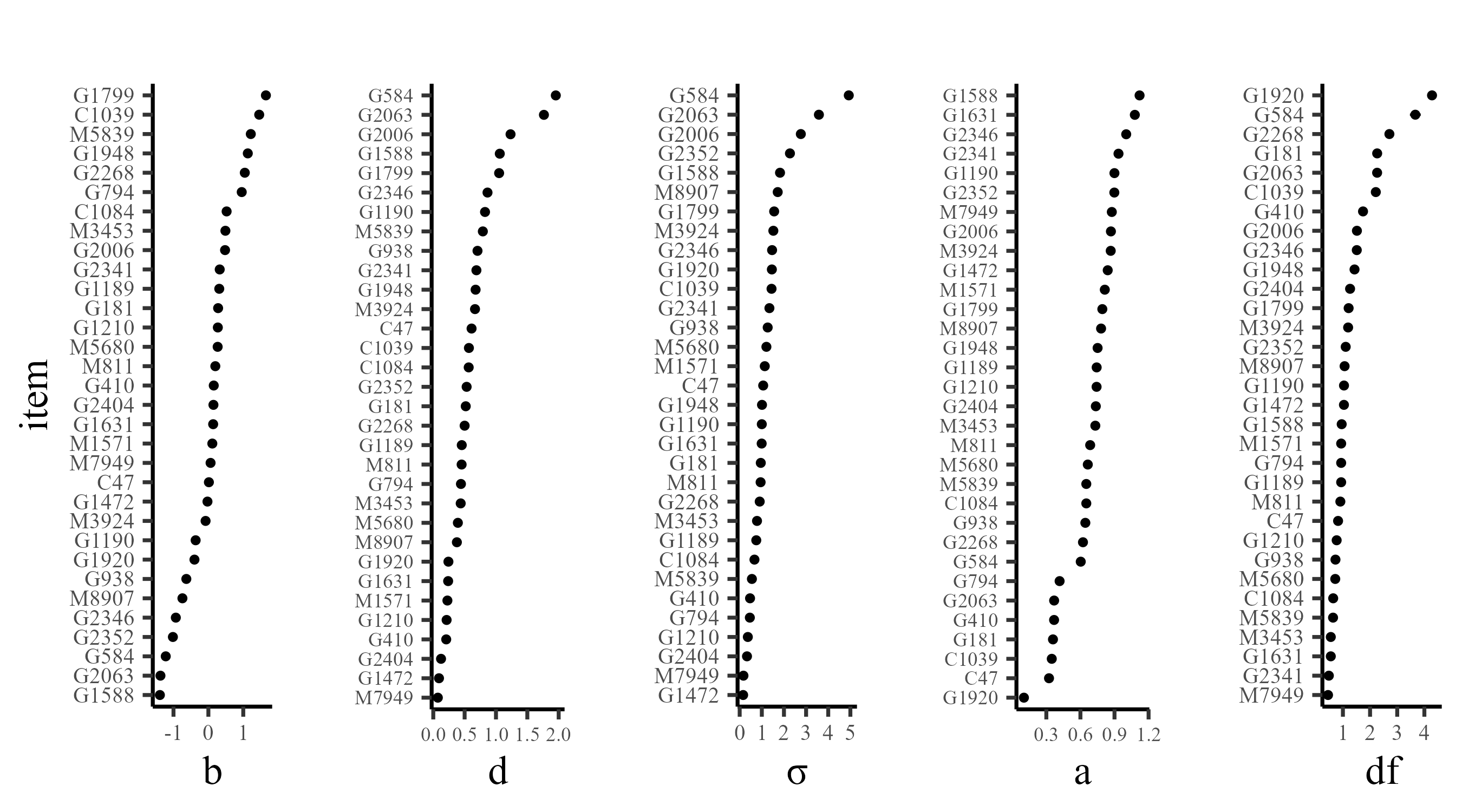 \[Y_{jiq} \sim \mathrm{Student\ T}(\mu_{iq}, \sigma_{ji}, \mathrm{df}_i) \\ \mu_{iq} = b_i + Q_q \times d_i \\ \sigma_{ji} = \frac{\sigma_i}{\mathrm{Exp}[a_i \times \theta_j]}\]