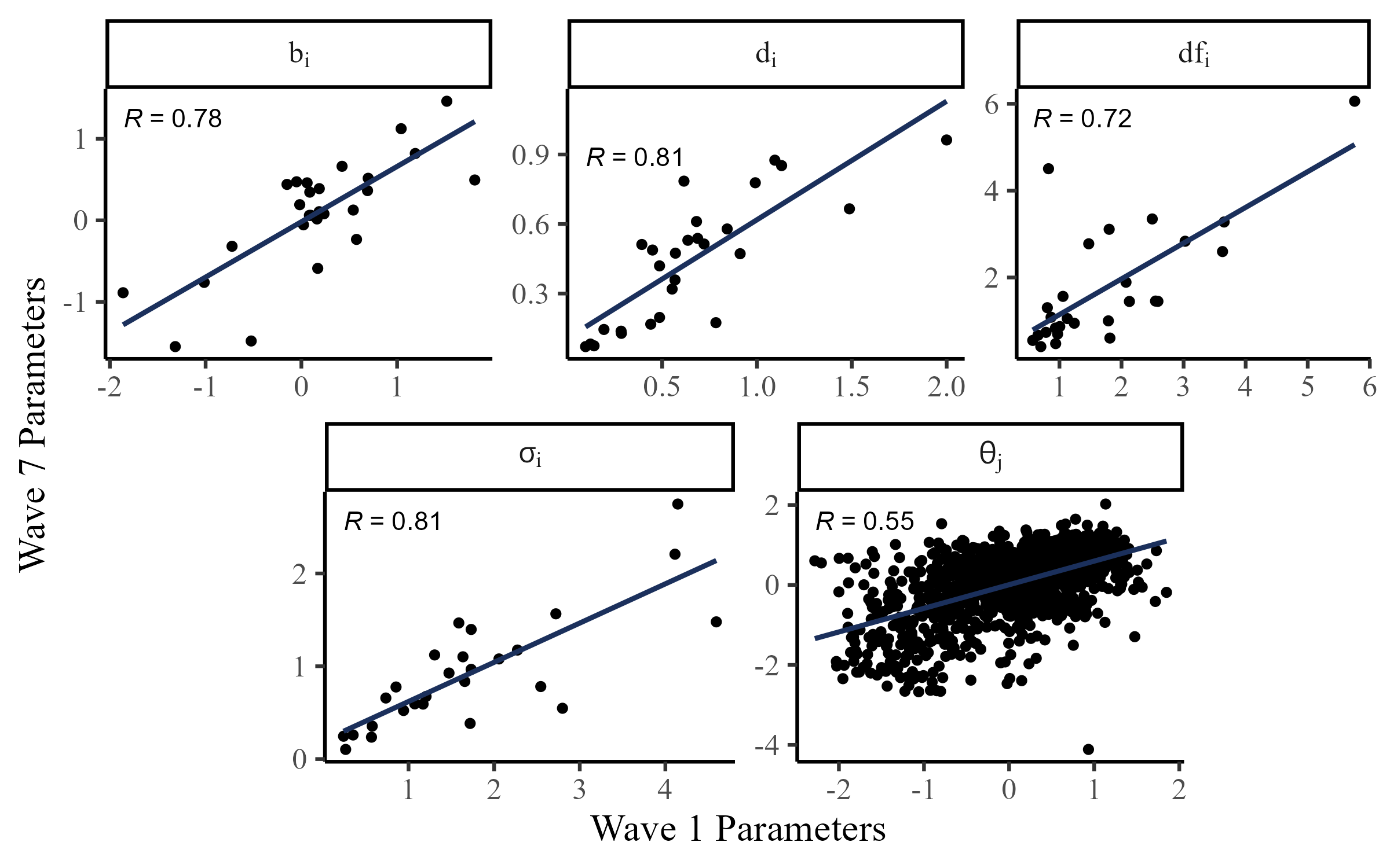 Given the complexity of the FPT items, item parameters are likely to change depending on many factors. Still, there seems to be reasonable stability even after a month between Wave 1 and Wave 7 (test-retest):