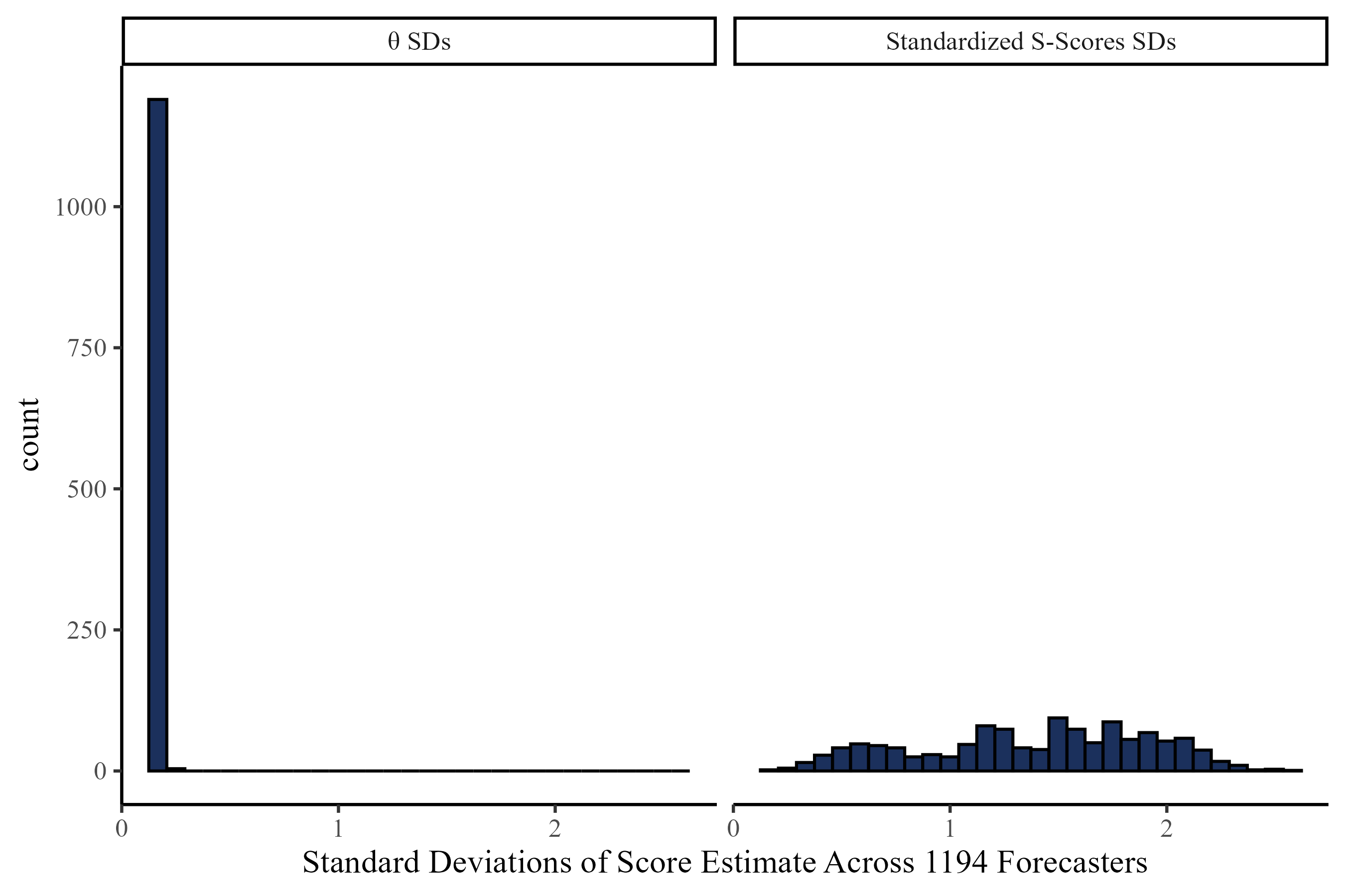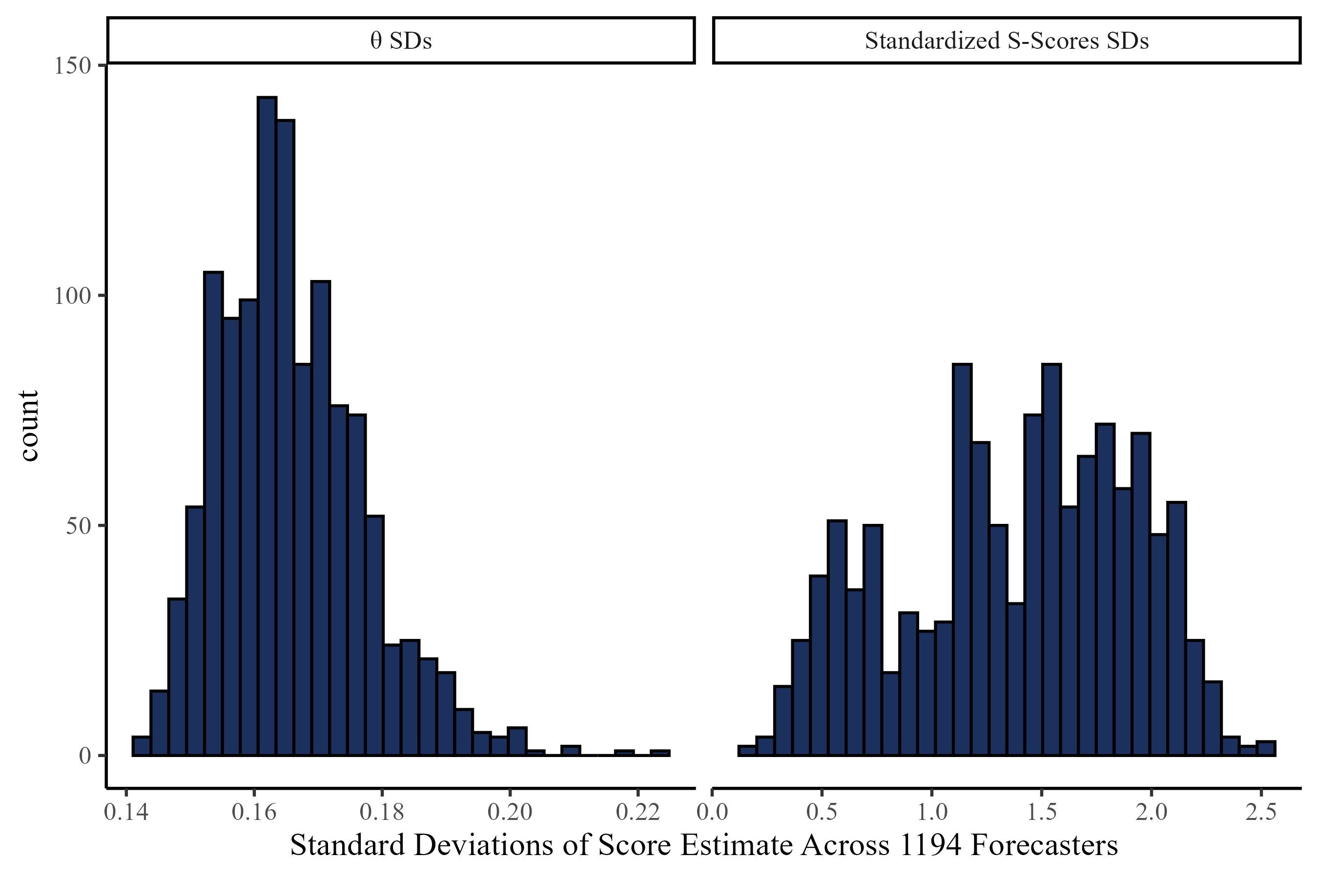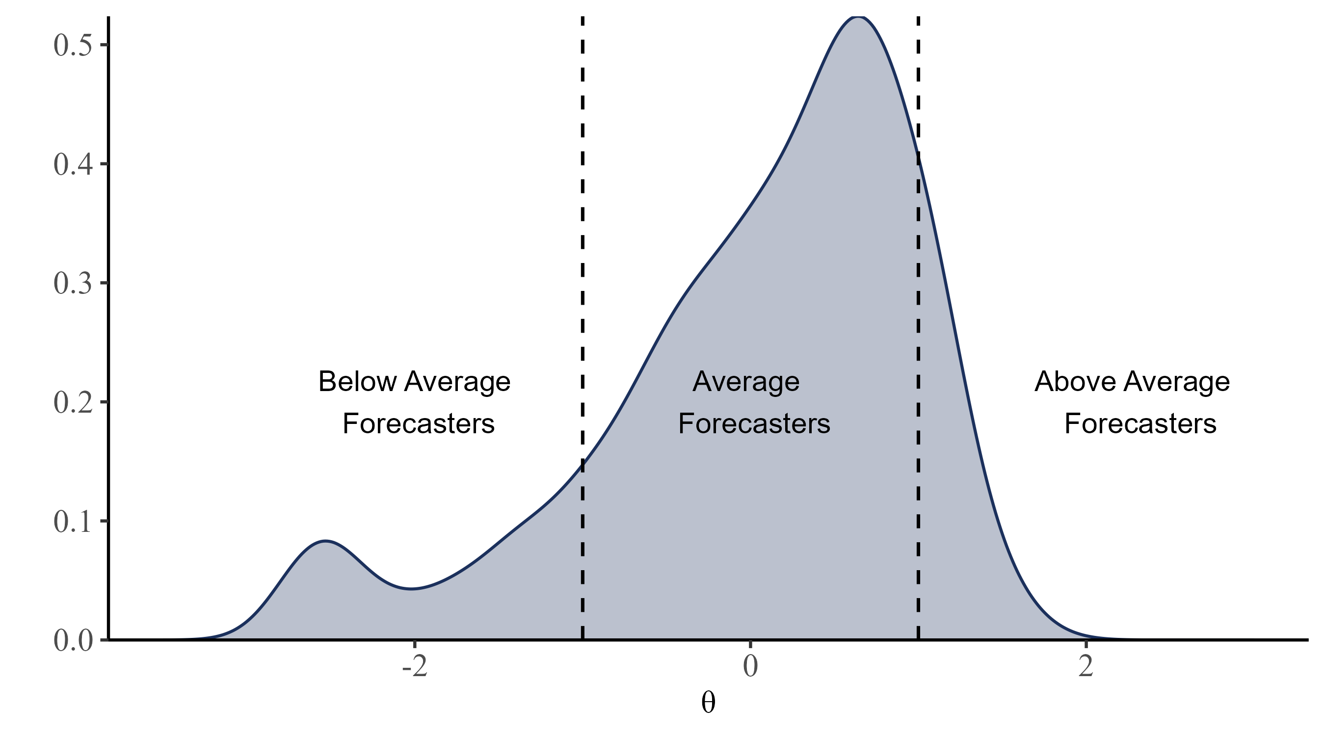 Distribution of \(\theta\) for the 1194 forecasters (better forecasters have higher \(\theta\) values).