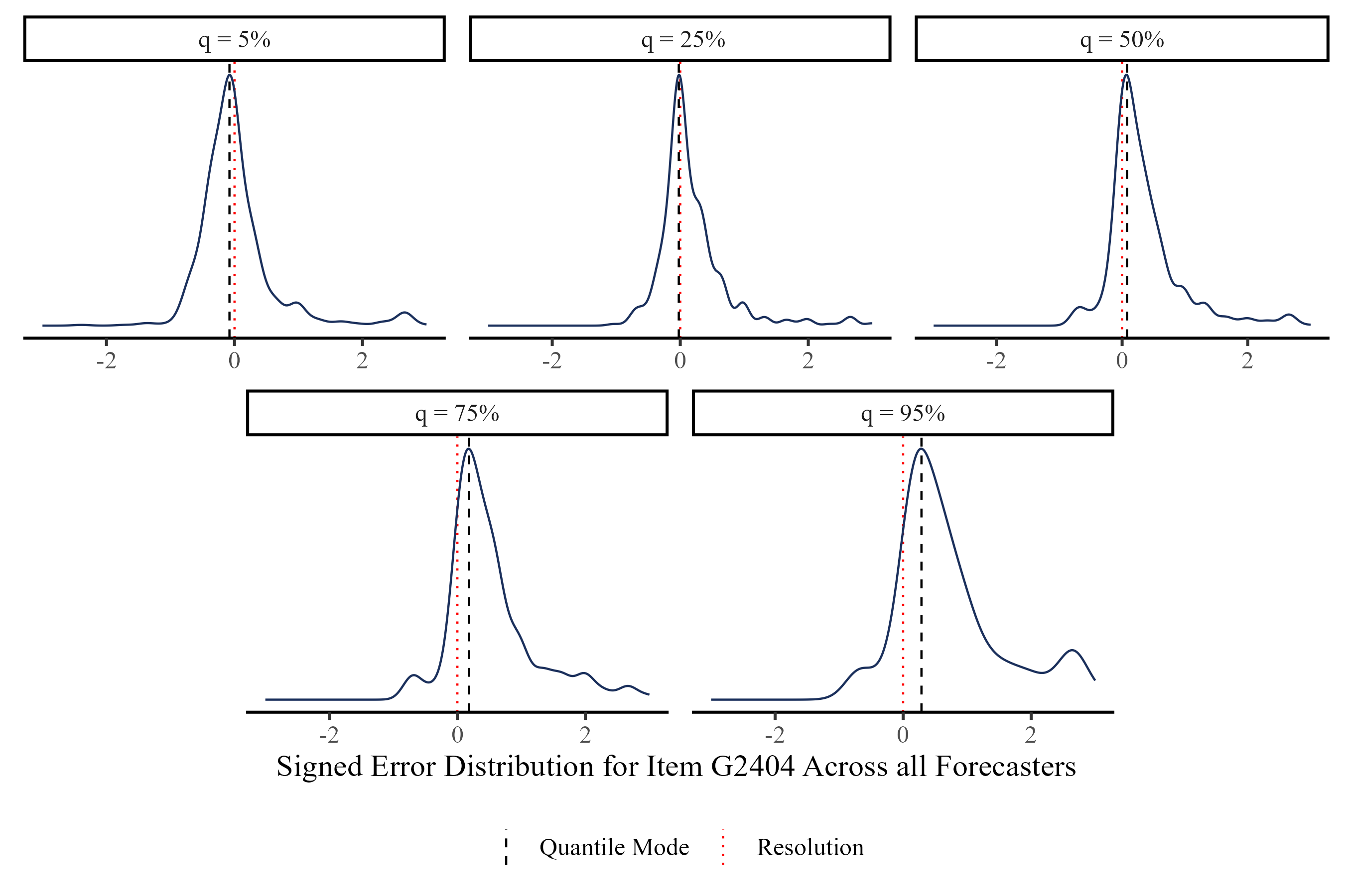Responses to FPT quantile forecast items are on very different scales (e.g. dollars/gallon, thousands of dollars, percentages,…). We define the outcome measure, historically scaled signed error, as