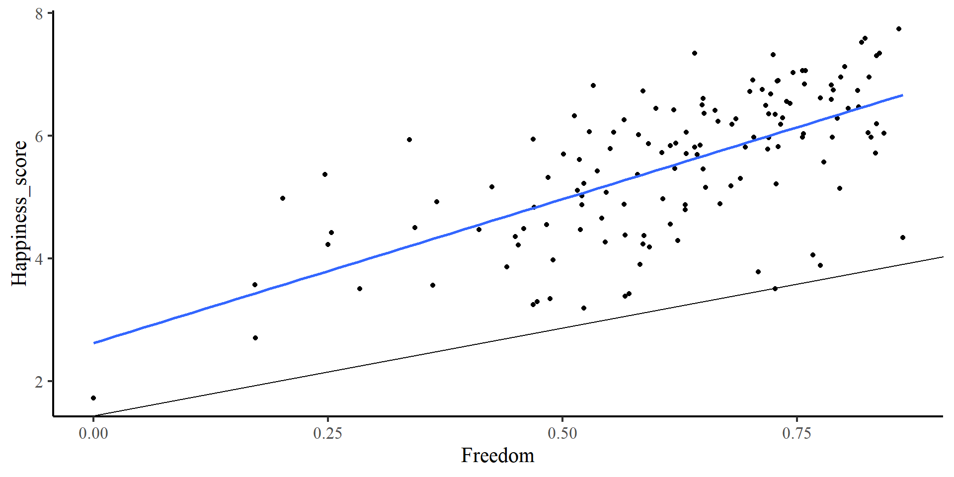 Now, after we add both freedom and GDP as predictors, we see that the dots are even less spread out
